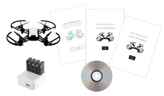ドローンとドローン飛行のサンプルプログラム、テキスト 等で構成されます。