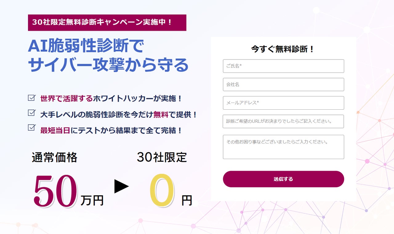 一ヶ月前のセキュリティ対策も危険に!最新AI技術による脆弱性診断サービスを提供開始!30社限定無料診断キャンペーン実施中!