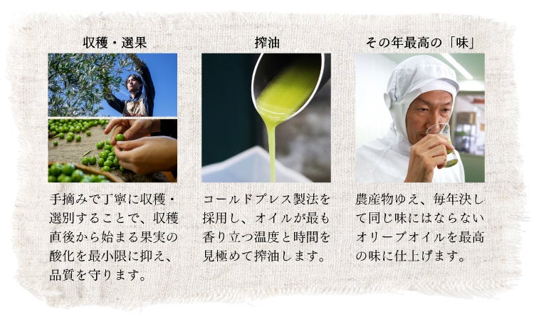 コールドプレス製法で生搾り。経験による時間と温度の細やかな調整が香り高いオイルを生み出します。