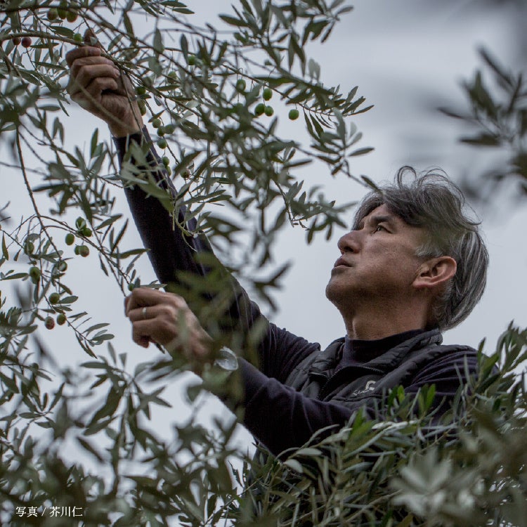 当園は、小豆島で約80年に渡ってオリーブと柑橘を育て、栽培から加工・販売までを行ってきました。スペインやイタリアなど海外の大産地と違って小豆島でのオリーブ栽培は、小さな島の中で段々畑を耕しオリーブを植え、大切に育てた果実は全て手摘み収穫、さらに当園では収穫後すべての果実を一粒ずつ品質や熟度ごとに人の手と目で選果して搾油します。それだけ手間ひまをかけるのは、三代目園主が先代から受け継いできた、日本・小豆島の井上誠耕園ならではの他産地ではできない細やかな手仕事でもって、量ではなく品質の高さで世界と勝負したいという想いからです。