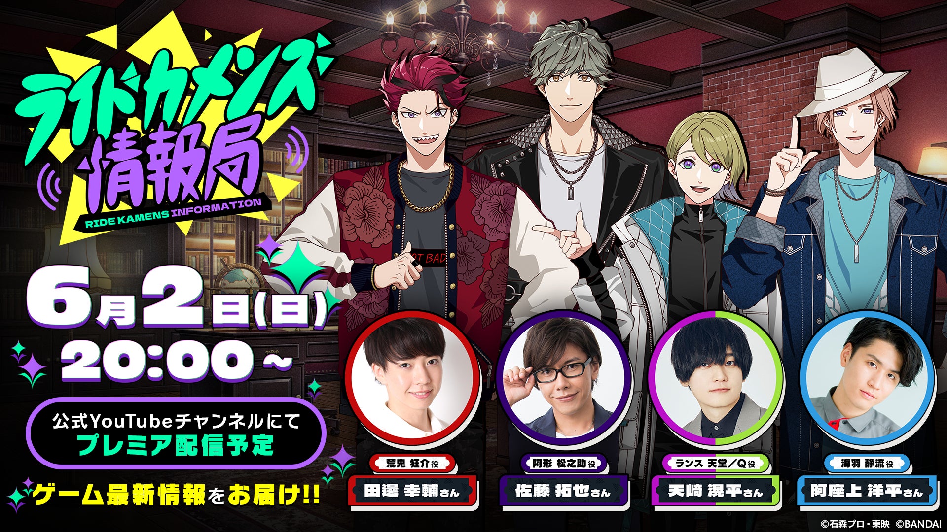 ライドカメンズに関する様々な情報をお届けする公式配信番組「ライドカメンズ情報局」が6月2日(日)20:00よりライドカメンズ公式YouTubeチャンネルにてプレミア配信いたします。