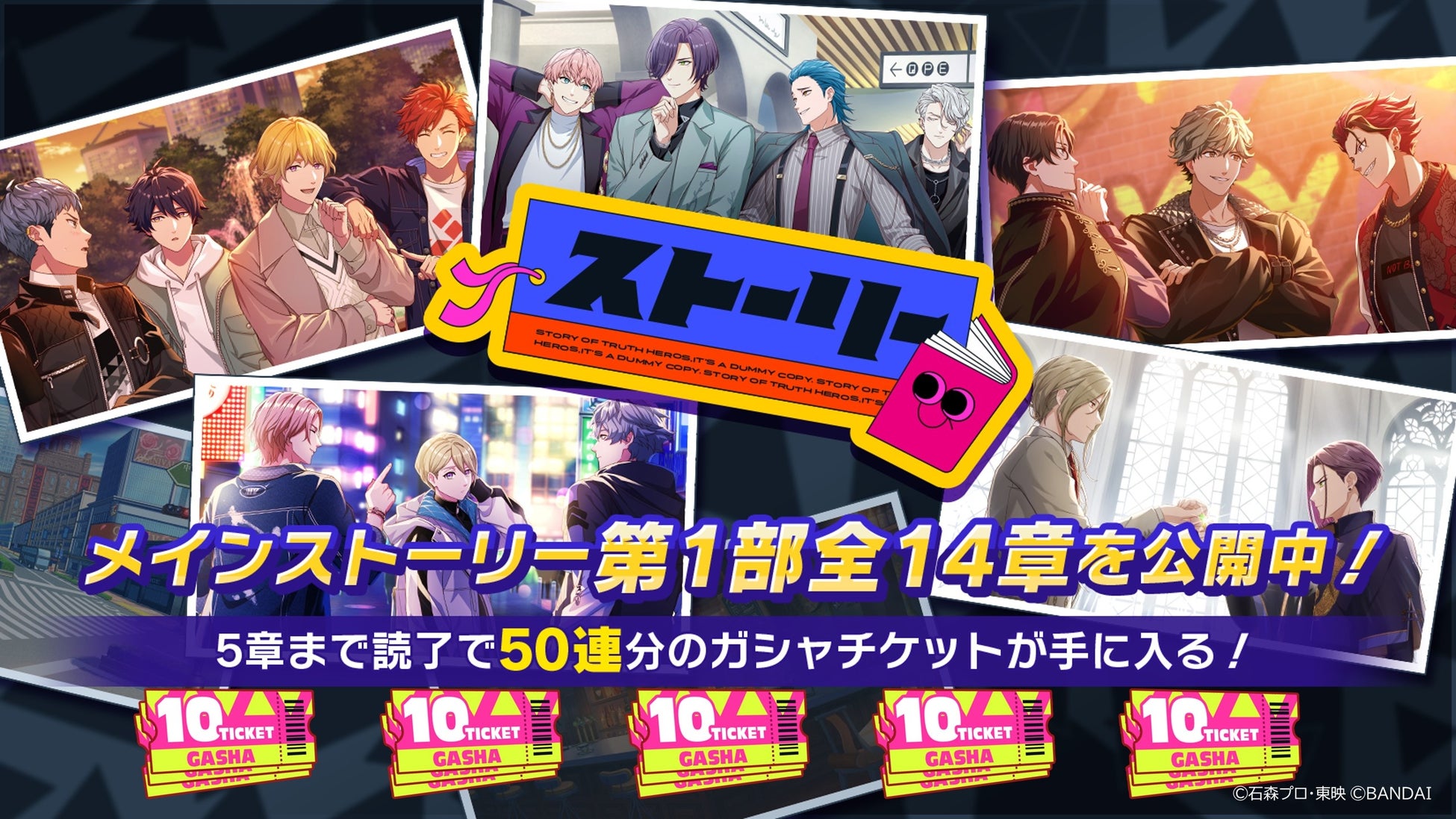 脚本家・高橋悠也氏執筆のメインストーリー第1部の1~5章の各章を読み終わるごとに10連分のガシャチケットをプレゼントいたします。メインストーリーを5章まで読み進めると、合計で50連分のガシャチケットを獲得できますので、是非メインストーリーを楽しみながらガシャチケットを手に入れましょう!