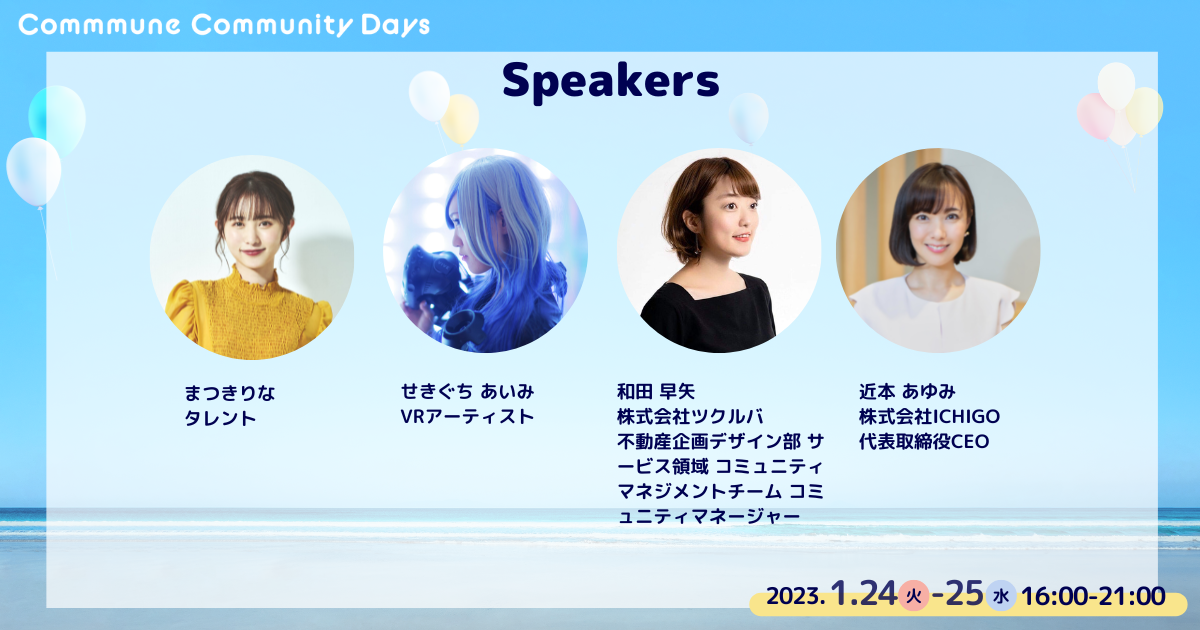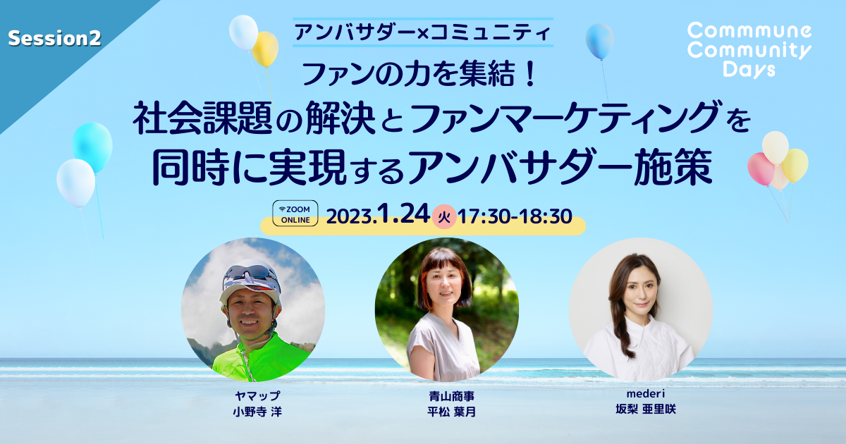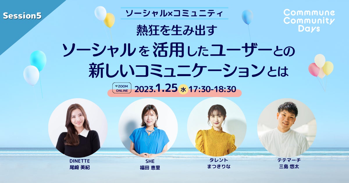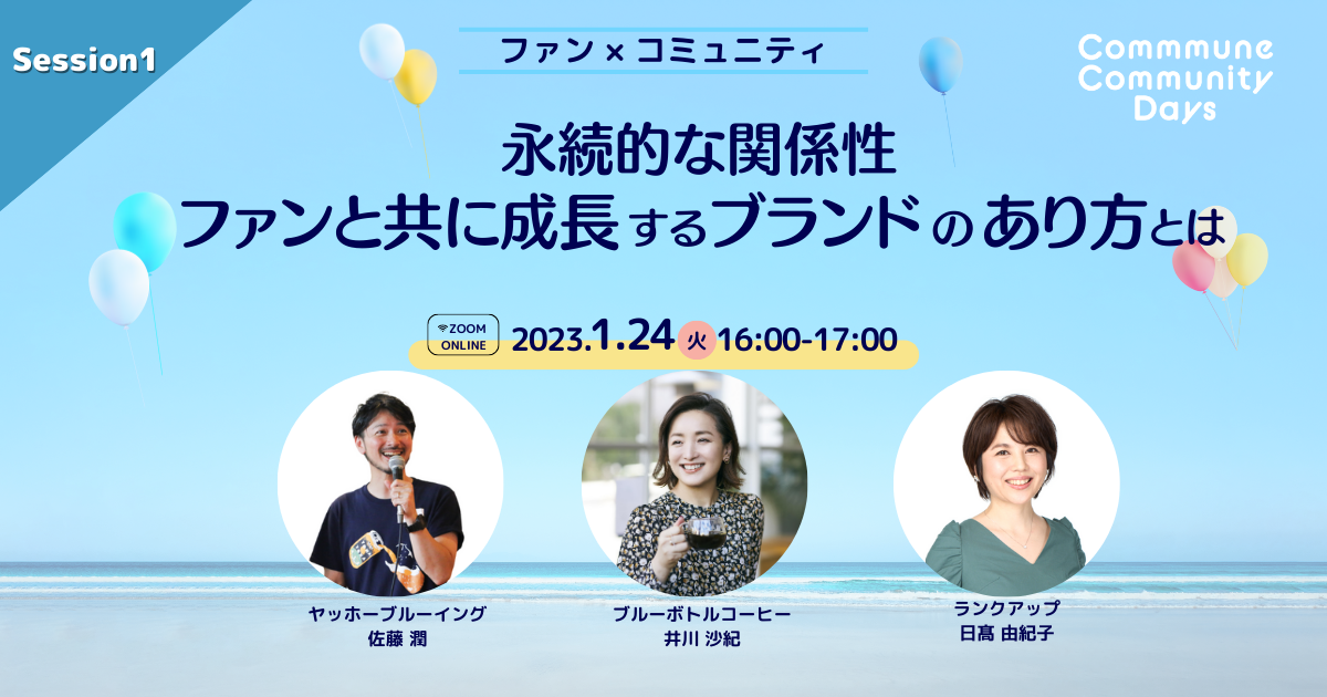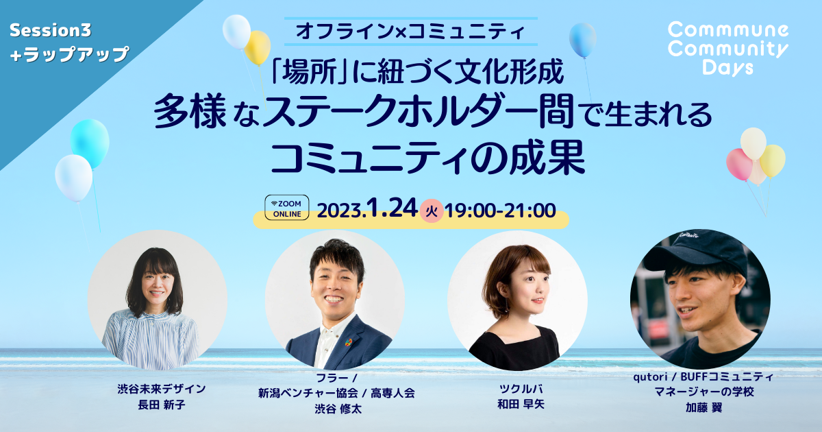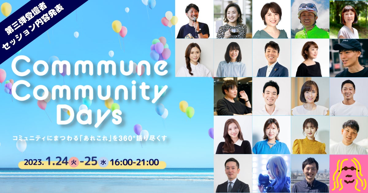 コミューン株式会社(本社:東京都品川区、代表取締役CEO:高田優哉)は、2023年1月24日(火)・25日(水)に開催するコミュニティに関わる全ての方に向けた無料オンラインカンファレンス「Commmune Community Days 〜コミュニティにまつわる『あれこれ』を360°語り尽くす〜」の第三弾ご登壇者とセッション一覧についてお知らせします。各業界のキーパーソンを招聘し、完全無料で開催させていただきます。また、参加者限定のオフライン交流会も後日実施しますので、皆様お誘い合わせの上ご参加をお待ちしております。