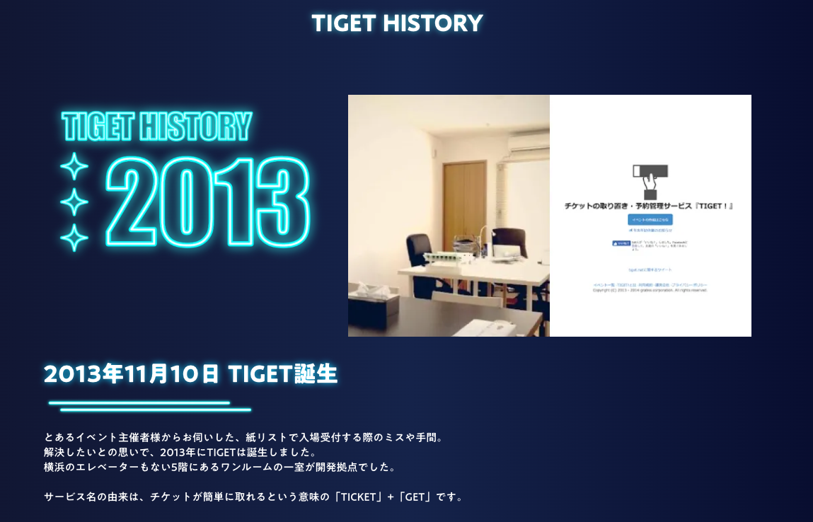 2013年、ワンルームの一室からスタートし、2023年に会員数100万人と突破したTIGETの、開発の歩みや開発秘話、TIGETへの思いなどを1年ごとに紹介しています。