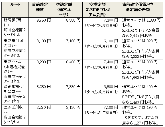 ※上記記載の金額はS.RIDEアプリに表示される金額です。「事前確定運賃」の金額には迎車料(420円)を含んでいます。「空港定額(通常ユーザ)」の金額には羽田空港への定額運賃の他に、予約機能をご利用時に収受するサービス利用料を合計した額を記載しています。「空港定額(S.RIDEプレミアム会員)」の金額には、羽田空港への定額運賃を記載しています。