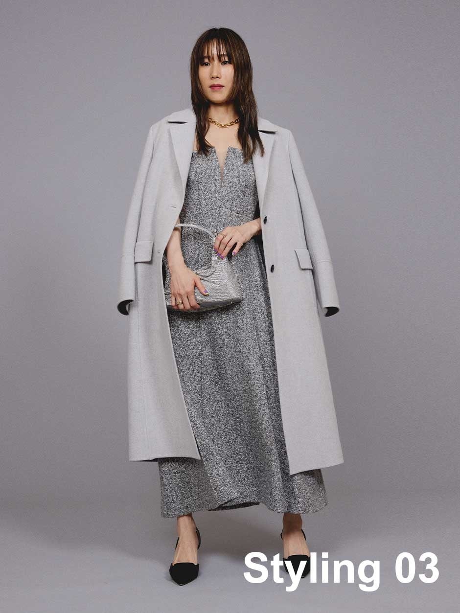 03:洗練のライトグレーで、透明感のある冬のドレスアップ