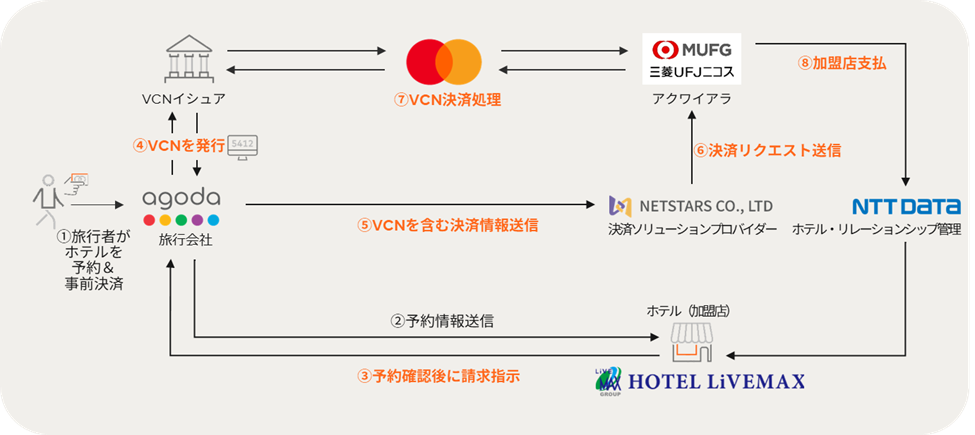 この仕組みでは、旅行者の予約情報を元にAgodaがVCNを発行した後、ネットスターズによるストレートスループロセッシング(STP*2)にてVCNによる決済処理が行われます。これにより、リブマックスホテルは手作業を介さずに直接バーチャルカード決済を行うことが可能になります。