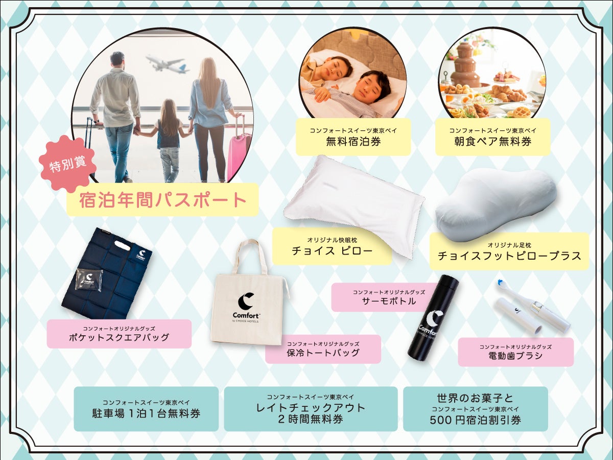 | 特別賞(1名様) | 全国のコンフォートブランドのホテルに毎月1回無料で宿泊できる「宿泊年間パスポート」 |