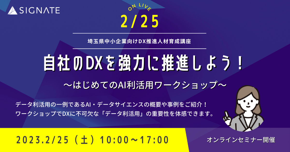 AI開発・運用、DX人材育成サービスを提供する株式会社SIGNATE(本社:東京都千代田区、代表取締役社長:齊藤 秀、以下 SIGNATE)は、埼玉県DX推進支援ネットワークの「埼玉県内企業DX推進人材育成講座補助金」の採択事業として埼玉県中小企業向けDX推進人材育成講座を開催します。SIGNATEが企業や自治体に対して提供実績のある講座で、過去の受講者アンケートでは85%以上の受講者がオススメしたいと回答した1日完結型のワークショップです。