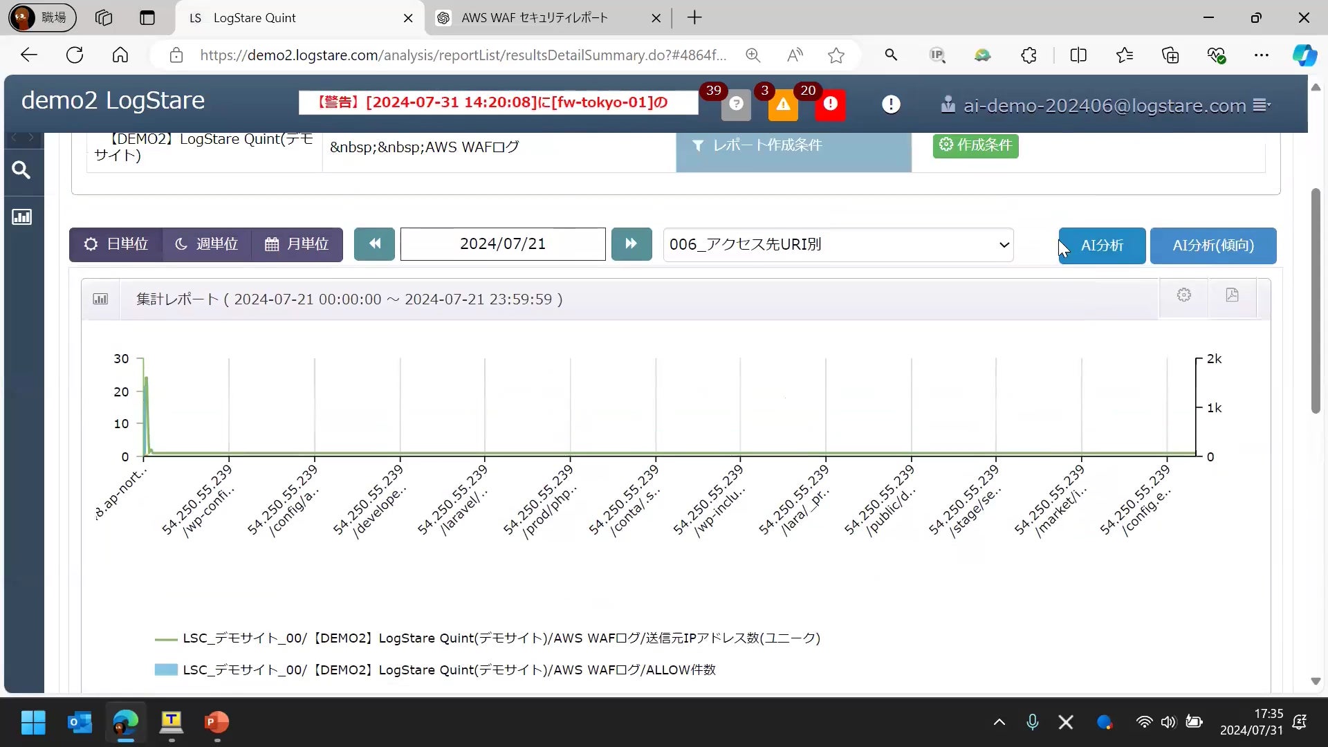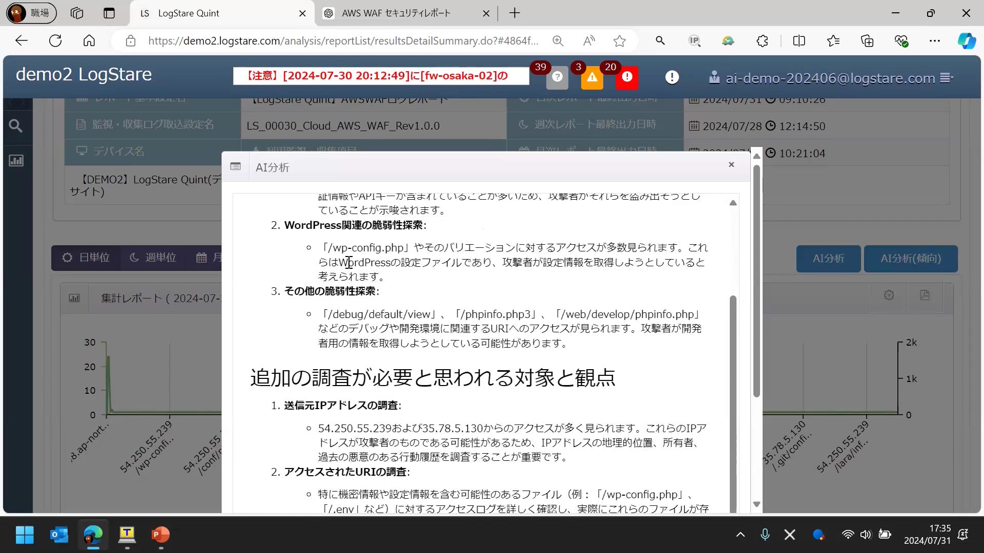 LogStareが開発・販売するセキュリティ運用プラットフォーム「LogStare」を用いて、まずはベテランのセキュリティエンジニアがログレポートからセキュリティリスクを分析する様子、続いて「LogStare」に搭載された生成AI分析機能を用いるとどのような分析結果が返ってくるか、両方をデモで見ることができました。