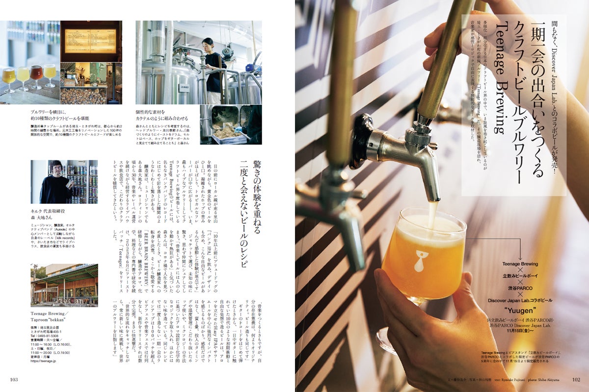 日本のクラフトビール界の中でいま旋風を巻き起こしている、埼玉・ときがわ町の新鋭ブルワリー「Teenage Brewing」。音楽家が感性とロジックで自由に表現する、独創的なビールに迫りました。そして、Teenage Brewing×立飲みビールボーイ 渋谷パルコ店×渋谷パルコ×Discover Japan Lab.の4社がコラボレーションした限定ビール「Yuugen」についてもご紹介!