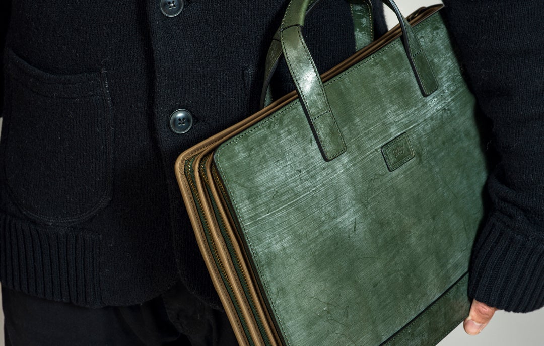 仕事の書類やパソコン、ランチボックスにペットボトル、アフターファイブのランニングシューズやシャワー後の着替えまで。二泊三日の出張に必要な荷物くらいなら、十分に対応できるバッグから、様々なレザーグッズまで幅広いアイテムがラインナップされている。