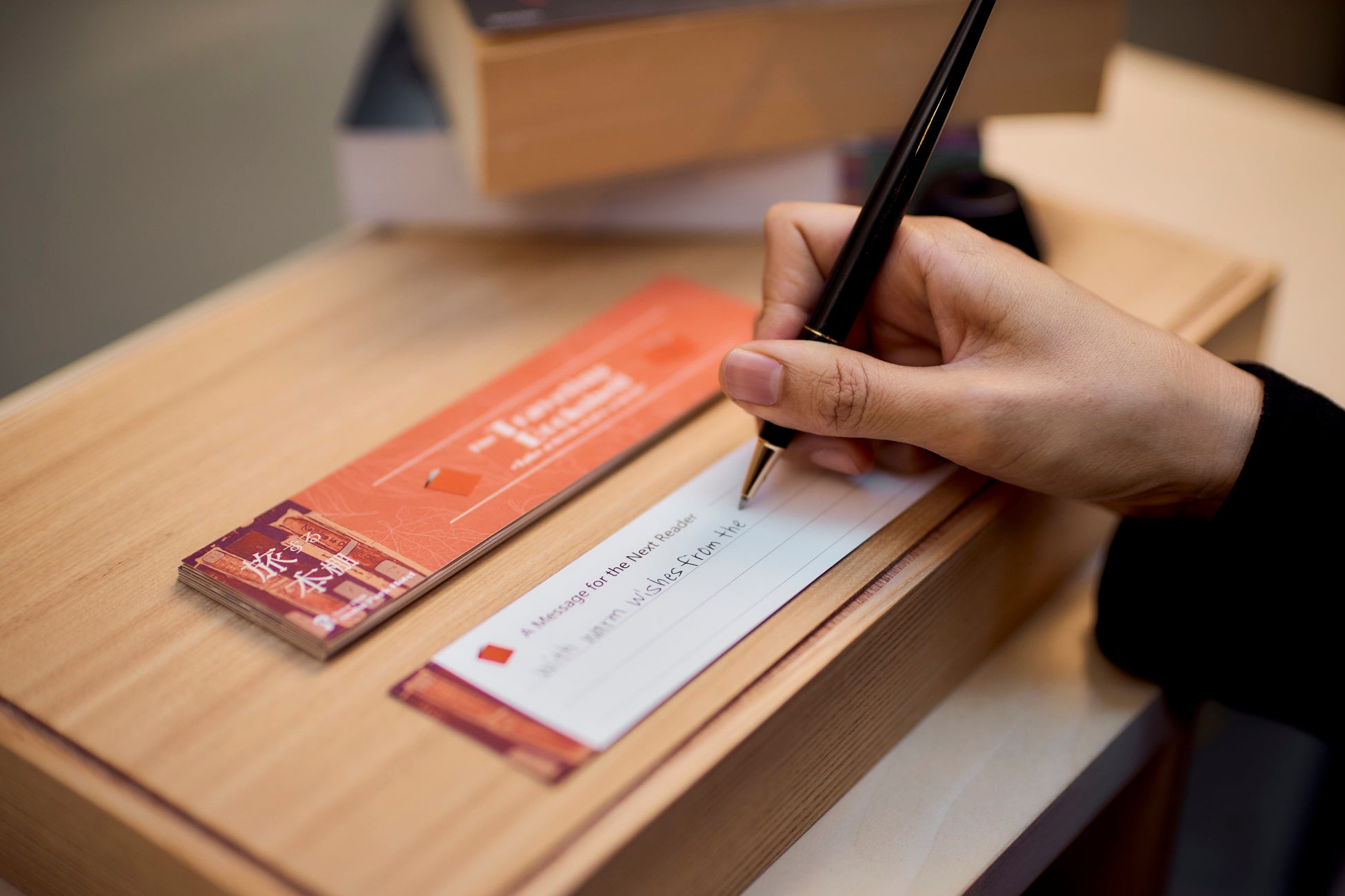 write a message to the next reader on the bookmark-style card provided by the