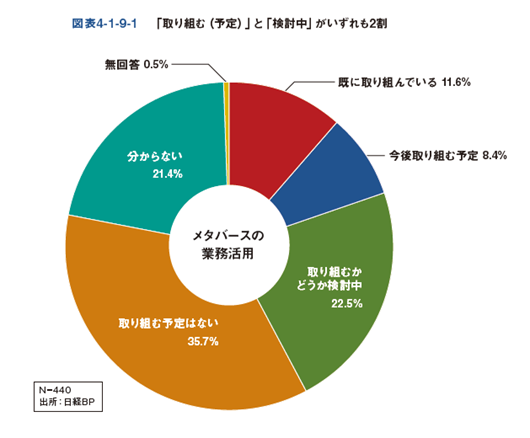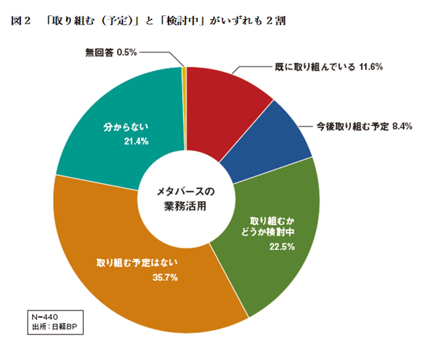 業務活用への取り組みが既に始まろうとしており、それが加速していくことも判明しました。メタバースの業務活用に「既に取り組んでいる」の11.6%、「今後取り組む予定」の8.4%、「取り組むかどうか検討中」の22.5%を合計した42.5%の企業が何らかの形で前向きな姿勢であることが明らかになりました(図2)。