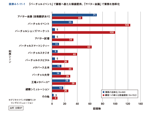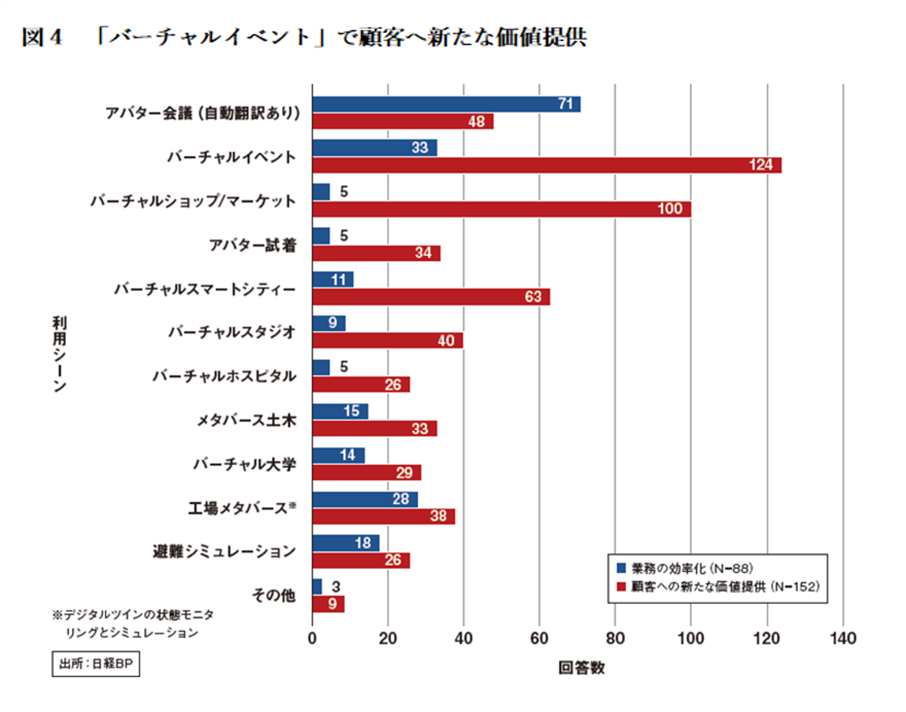 その結果から当初使われそうな利用シーンが浮かび上がってきました。顧客への新しい価値提供では「バーチャルイベント」、勤務先内での業務効率化には「アバター会議」の割合がともに全体の約8割と集中したからです。このことからはメタバースの多彩な利用シーンがまだそれほど浸透していない現実も明らかになりました(図4)。
