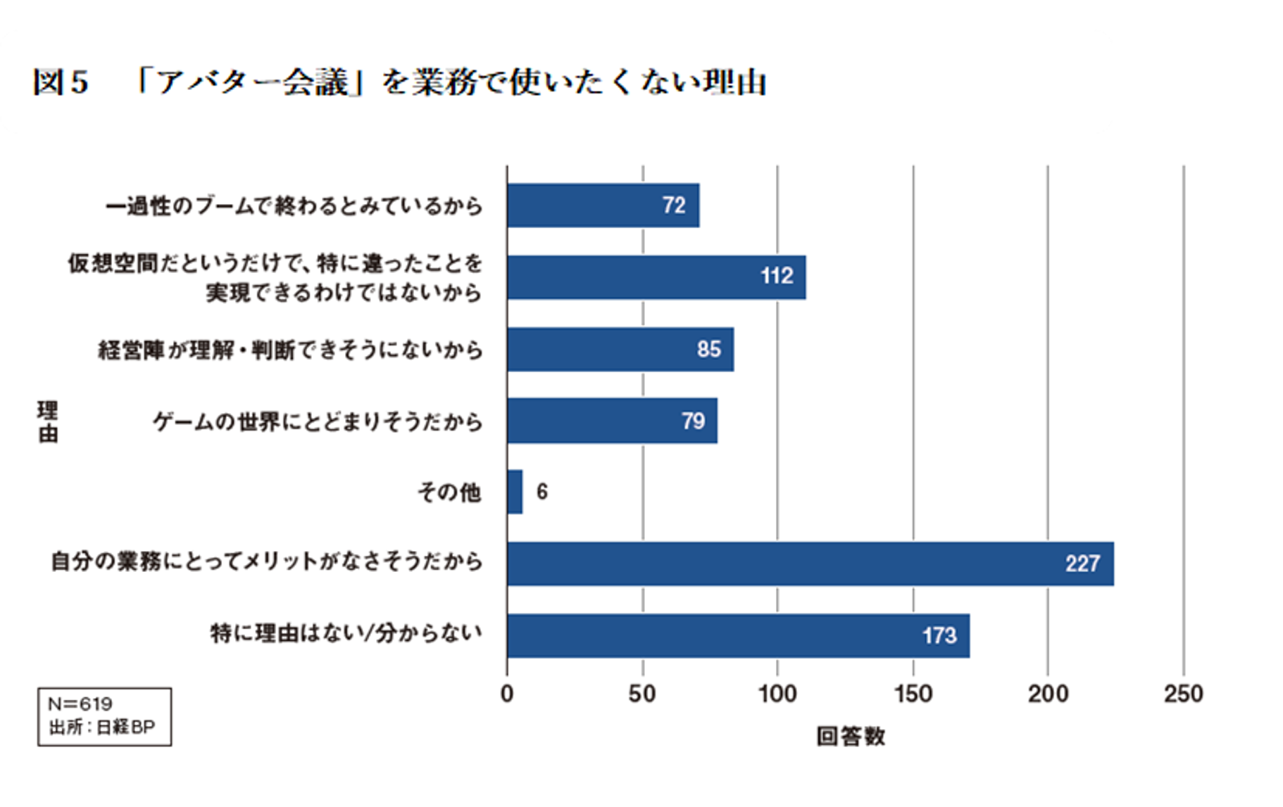 企業向け調査と個人向け調査の結果から、会社と現場の意向が真逆と言えるほど差があるケースが見つかりました。その1つが利用シーンの「アバターを使うオンラインコミュニティーやオンライン会議」を業務で使いたいかどうかを調査した結果です。企業調査では上述したように企業が使いたい利用シーンのトップでした。一方のビジネスパーソン3000人を対象とした個人調査では、「業務で使いたくない」利用シーンとして「アバターを使うオンラインコミュニティーやオンライン会議」を選んだ人が619人と最多でした。理由としては「自分の業務にとってメリットがなさそうだから」がトップでした(図5)。