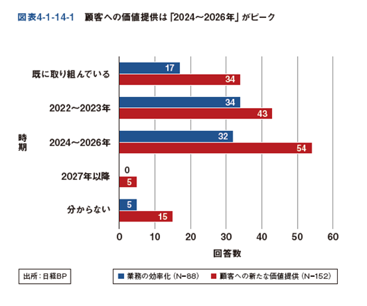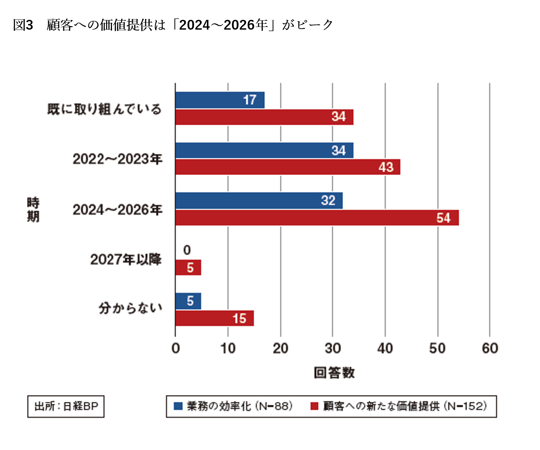 また、活用に前向きな企業の約半数が2023年までに業務の効率化や顧客への新たな価値提供のためにメタバース活用に取り組むと回答しました。取り組み時期は2024~2026年がピークとなっています(図3)。