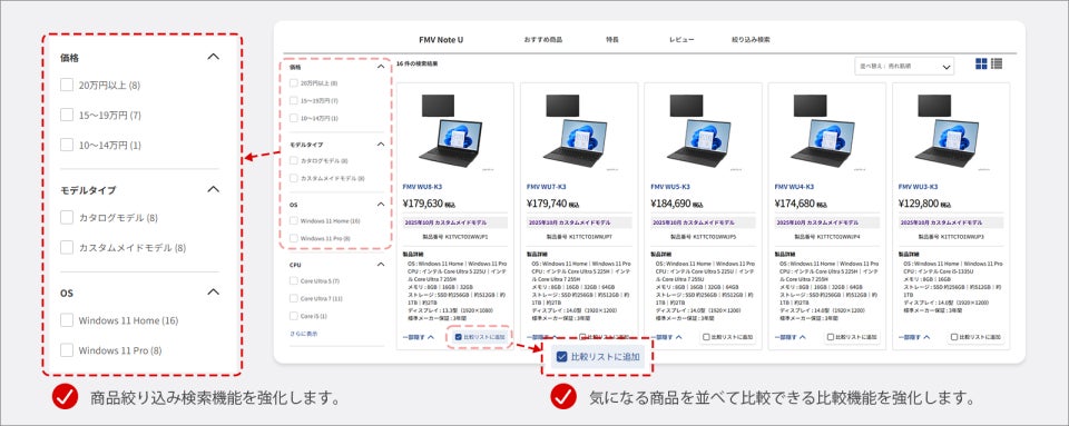 メモリ容量やストレージなどのスペックで商品を絞り込める検索機能や、気になる複数の商品を一画面で並べて比較できる比較機能を強化します。さらに、選択した商品やスペック情報をカートに保存できる機能を追加。一度選んだ内容を保持したまま再訪問できるため、再度一から選び直す手間がなくなり、じっくり検討したうえでのスムーズな購入につなげます。