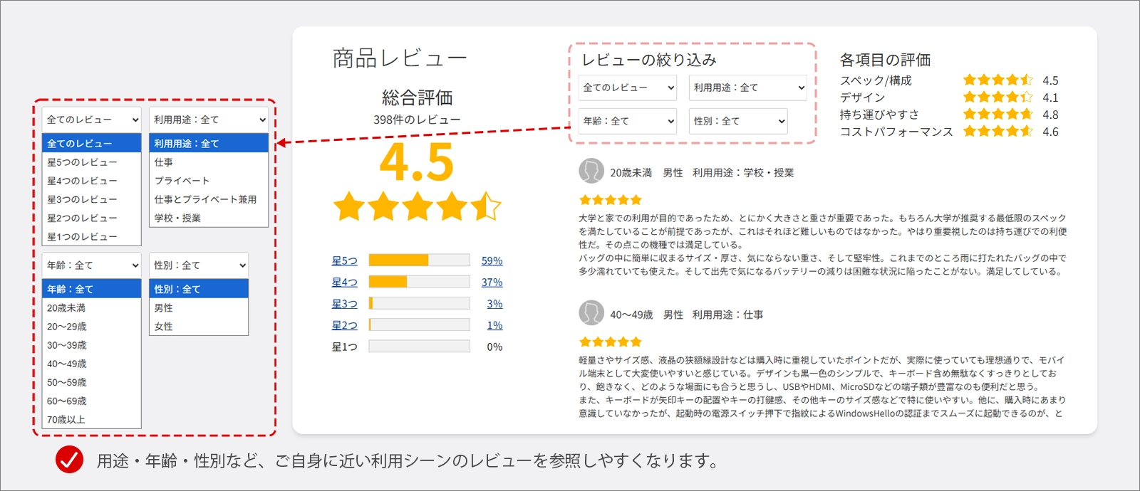 購入者レビューの掲載単位をシリーズ単位から商品単位へと細分化し、より具体的でリアルな使用感を確認いただけるようになります。さらに、用途・年齢・性別などの条件で絞り込みが可能となり、ご自身に近い利用シーンのレビューを参照しやすくなります。スペックだけでは判断しづらい実際の使い心地や選定のポイントを把握しやすくすることで、お客様が納得して製品を選べる環境を作ります。