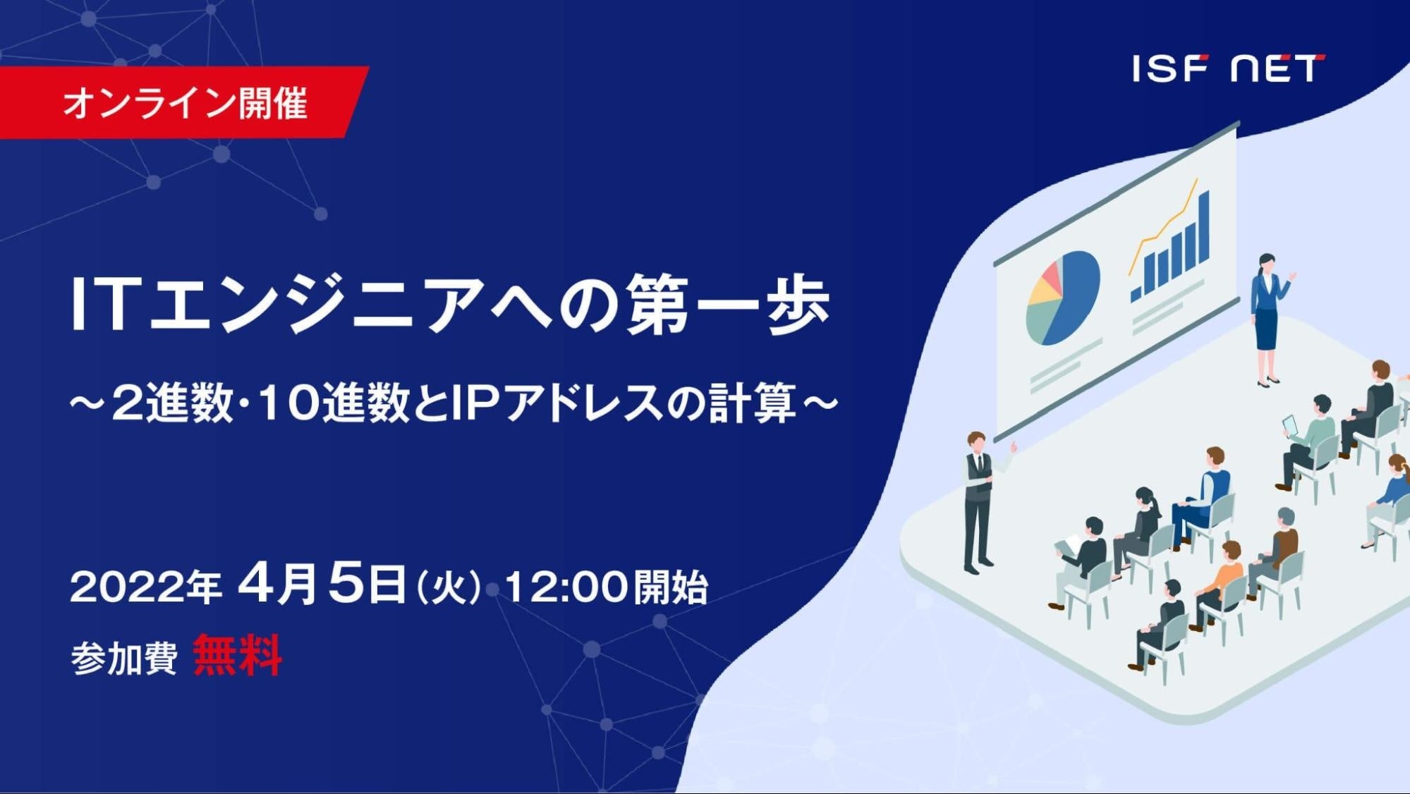 株式会社アイエスエフネット(本社:東京都港区、代表取締役:渡邉幸義)は、4月5日(火)の日程にて、無料セミナー「ITエンジニアへの第一歩~2進数・10進数とIPアドレスの計算~」を開催します。