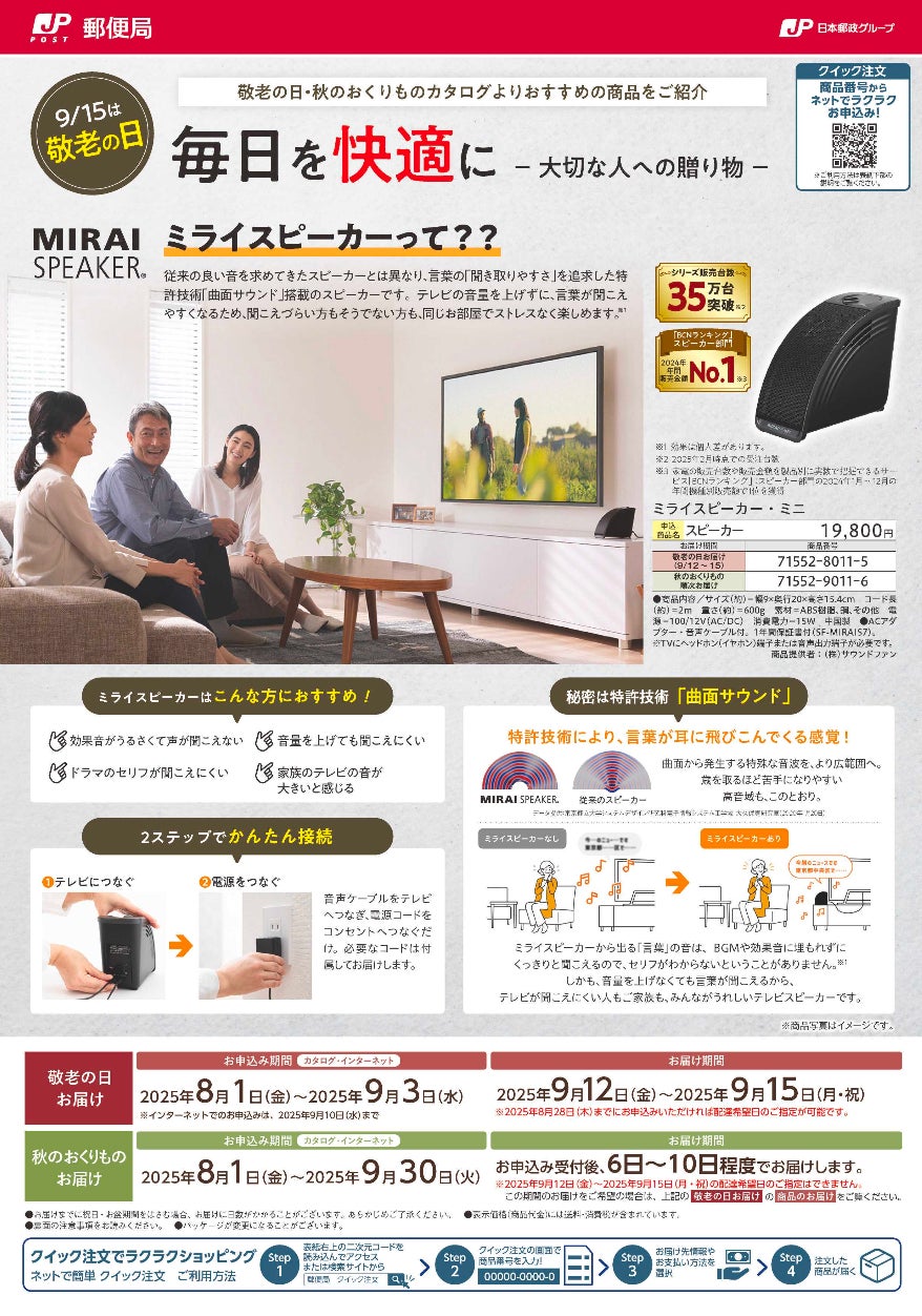 「100年のスピーカーの歴史」に聞こえにくさの解消という新しい視点を提示し、特許技術「曲面サウンド」をもってサウンド領域に新たな価値と可能性を提供する株式会社サウンドファン(所在地:東京都中央区、代表取締役社長:山地浩、以下「当社」)は、「ミライスピーカー・ミニ」が株式会社郵便局物販サービス(本社:東京都江東区、代表取締役社長:荒若 仁、以下「郵便局物販サービス」)より、2025年8月1日発刊される「敬老の日・秋のおくりものカタログ」に掲載され、全国の郵便局でお申込みができるようになりましたことをお知らせいたします。