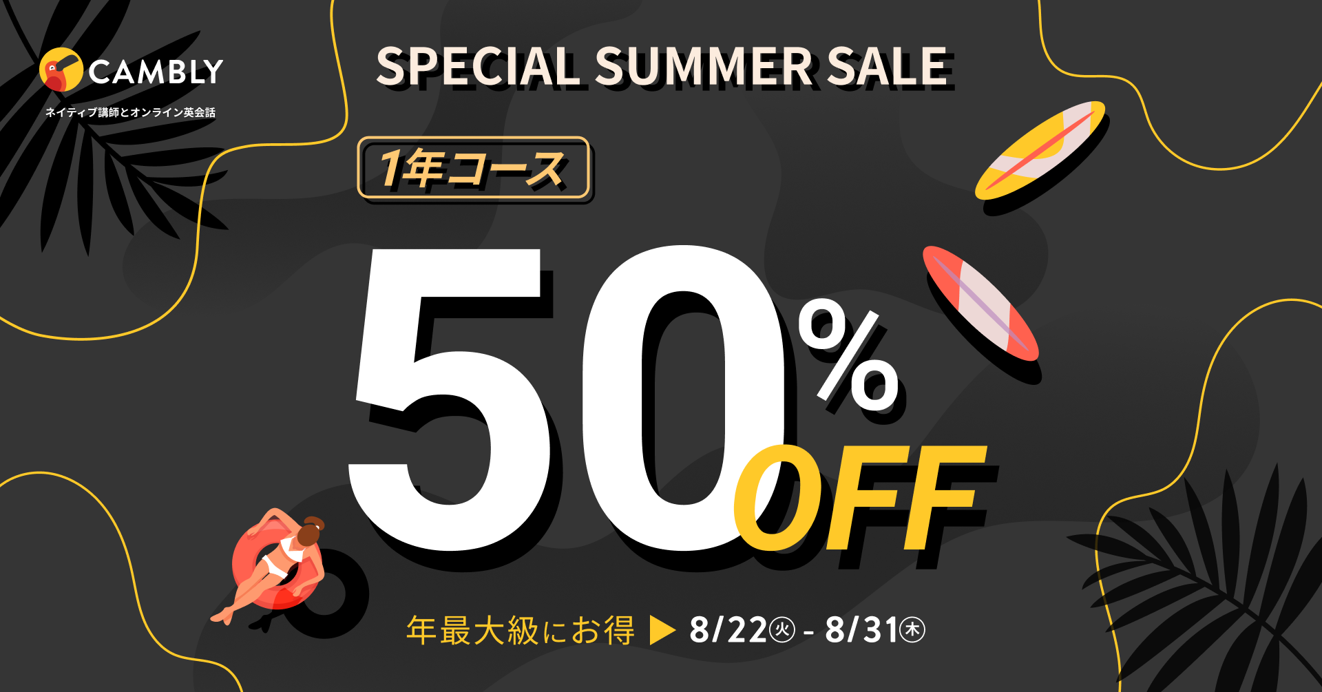 年最大級の割引!ネイティブ講師の英会話レッスンが月1,984円〜!1年コース受講料50%OFFのSpecial Summer Sale開催【オンライン英会話 CAMBLY(キャンブリー)】