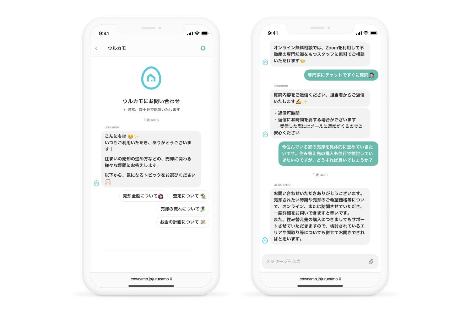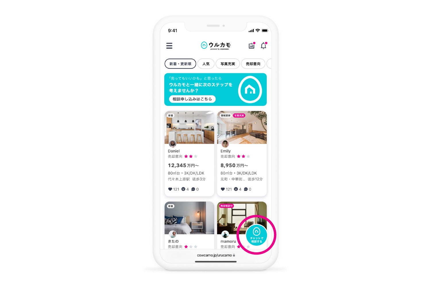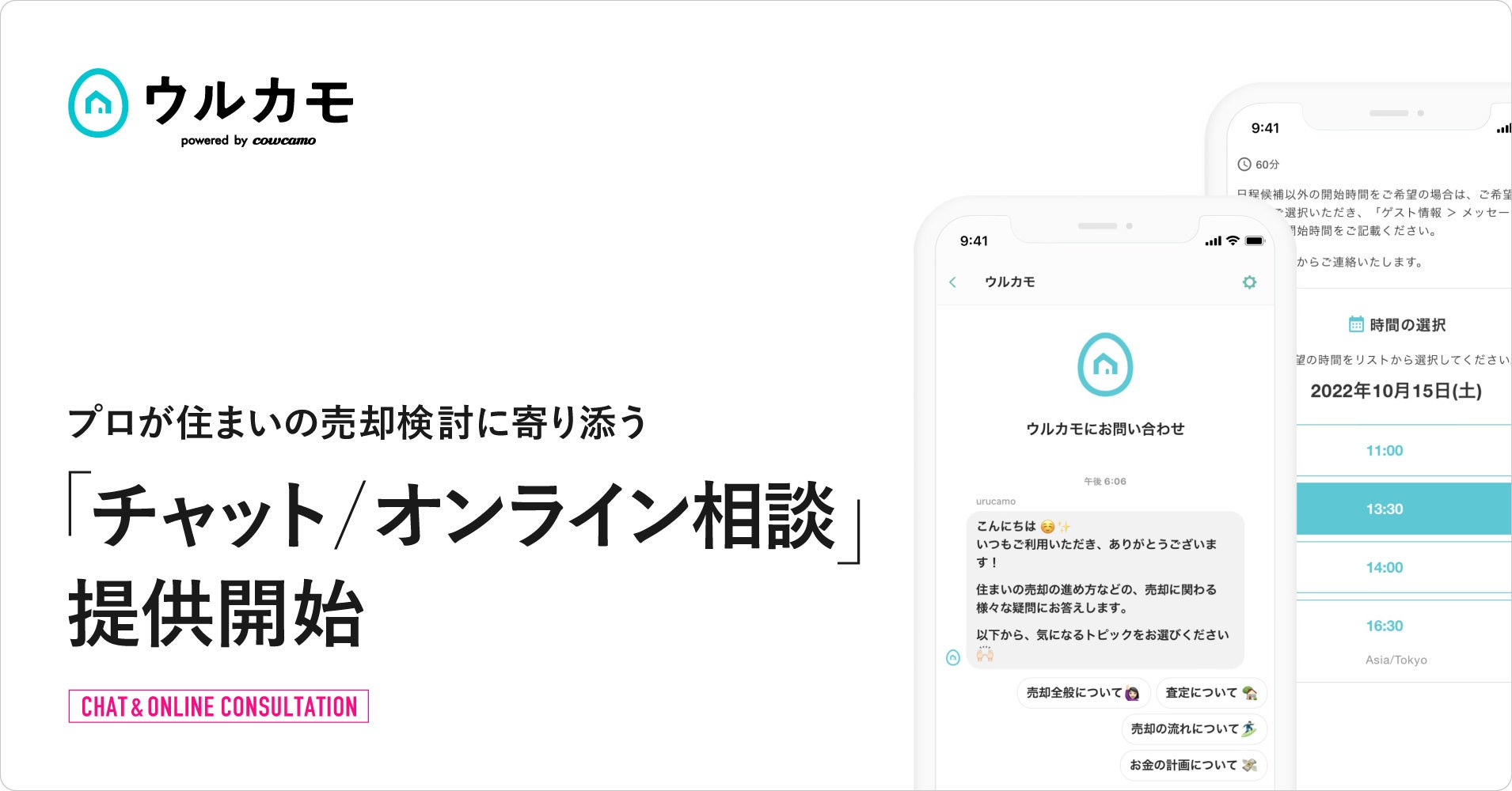 株式会社ツクルバ(本社:東京都目黒区、代表取締役CEO 村上 浩輝、以下「ツクルバ」)が運営する、家を売りたい人と買いたい人のマッチングサービス「ウルカモ」(https://cowcamo.jp/urucamo)は、2022年10月11日(火)より、ウルカモの使いこなし方から具体的な売却相談まで、ツクルバの不動産売却の専門スタッフに気軽に相談できる新機能「チャット/オンライン相談」を提供開始します。