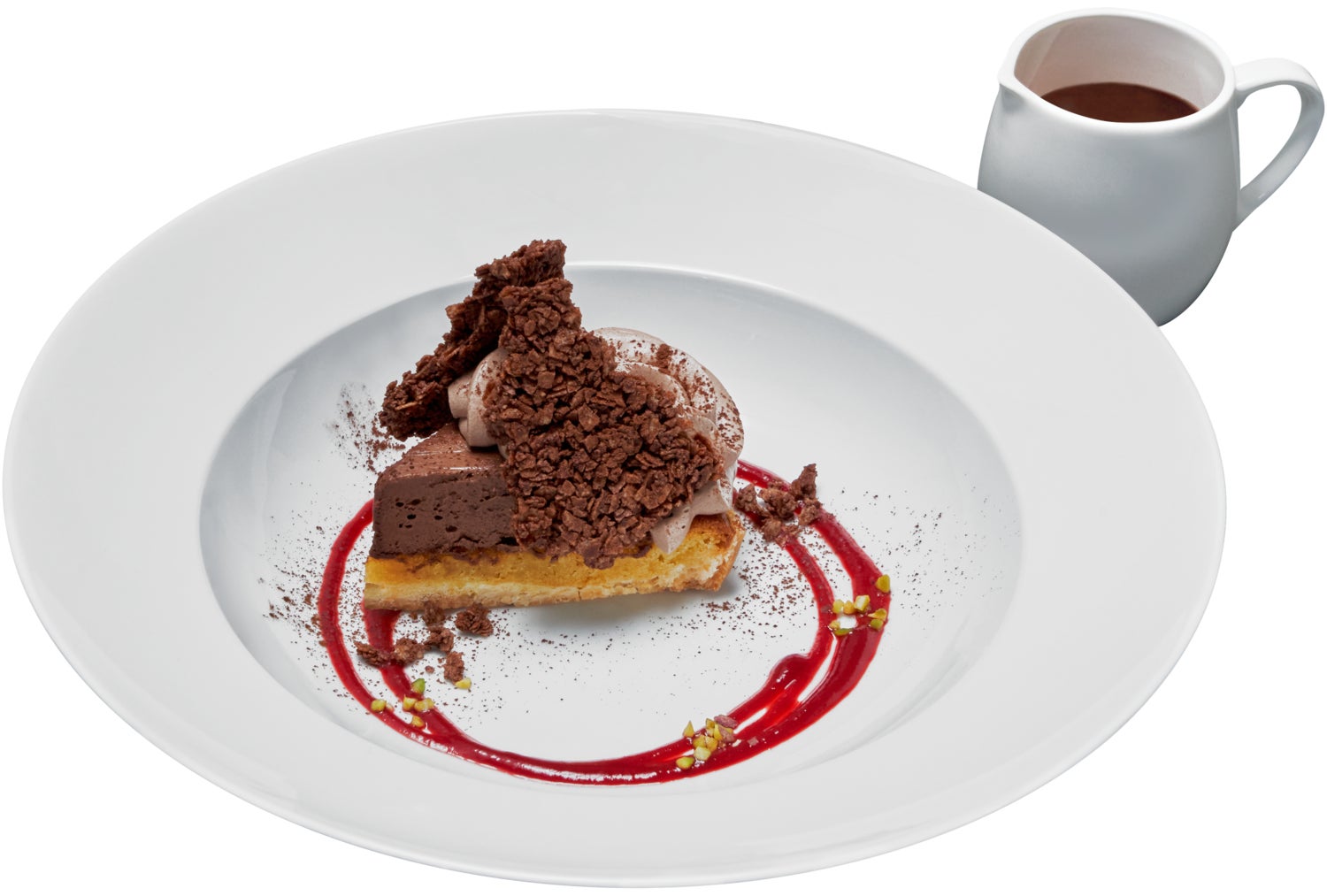 とろっとしたチョコレートソースをかけて仕上げる、甘酸っぱいラズベリーソースがアクセントのチョコ好きにはたまらない一品です。