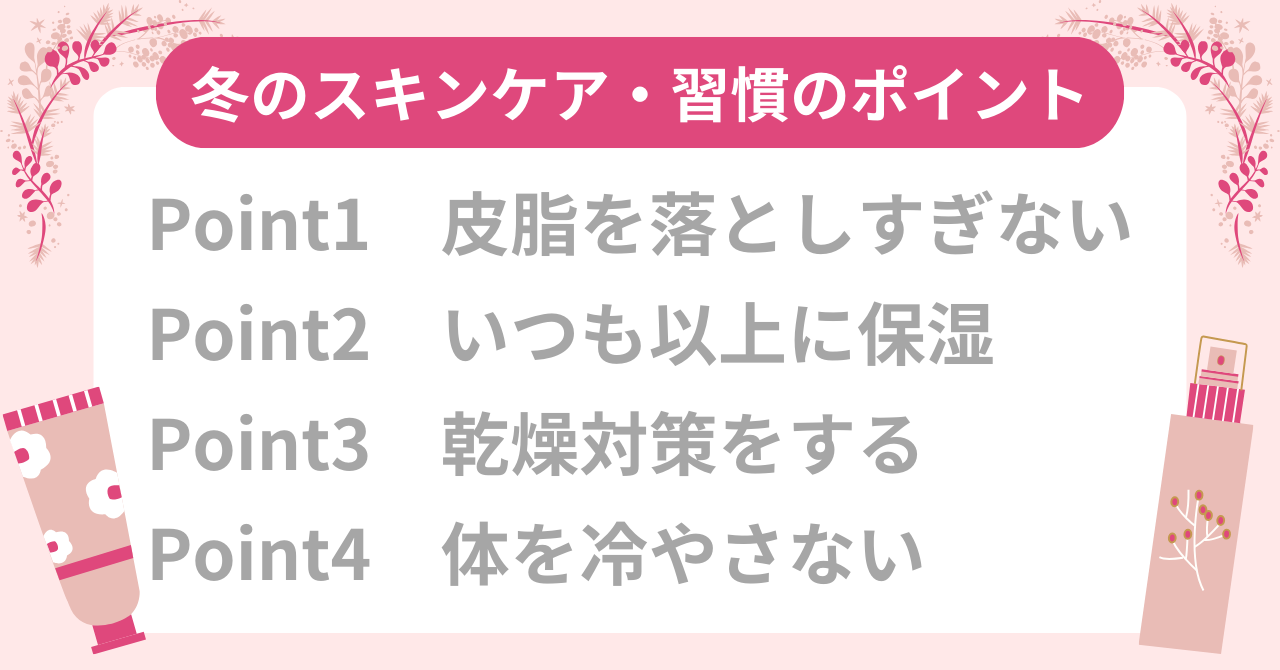 スキンケアや習慣のポイントを意識して、乾燥しやすい冬も美肌で乗り越えましょう。