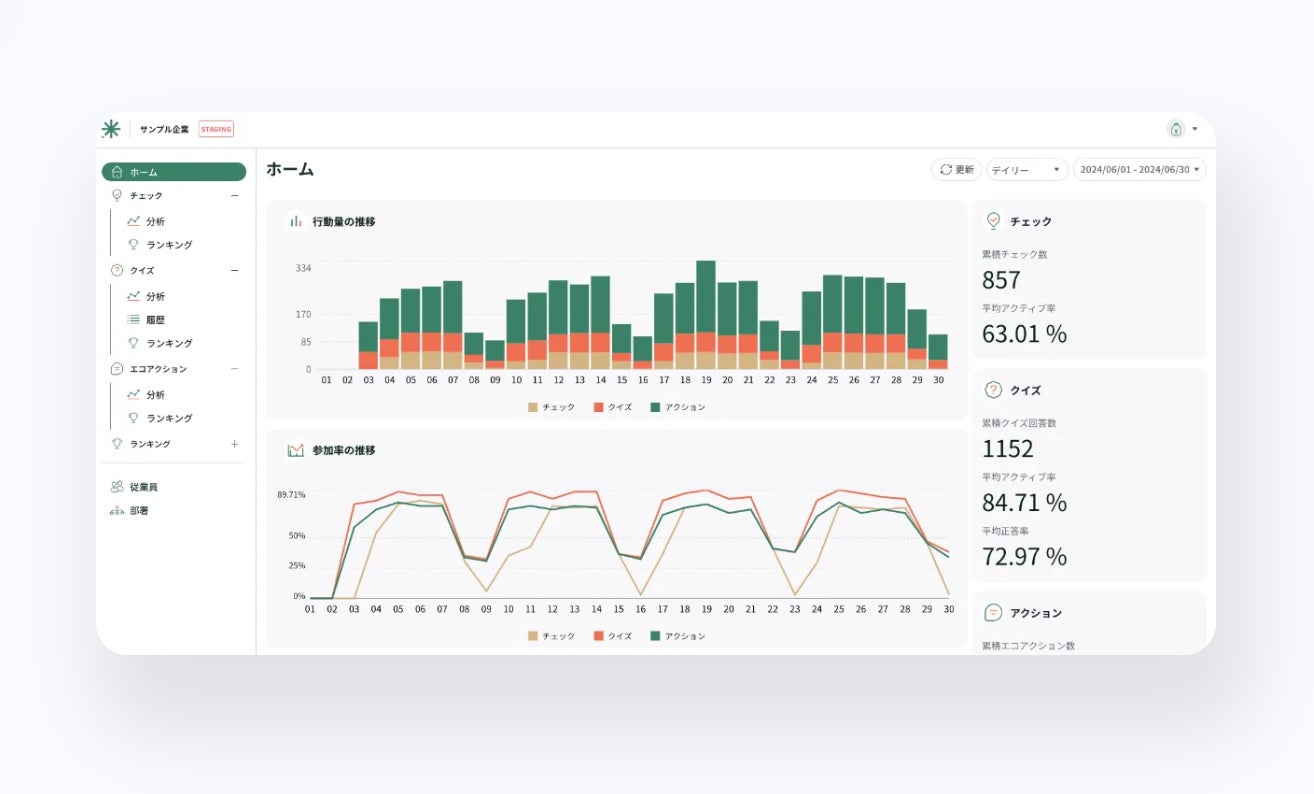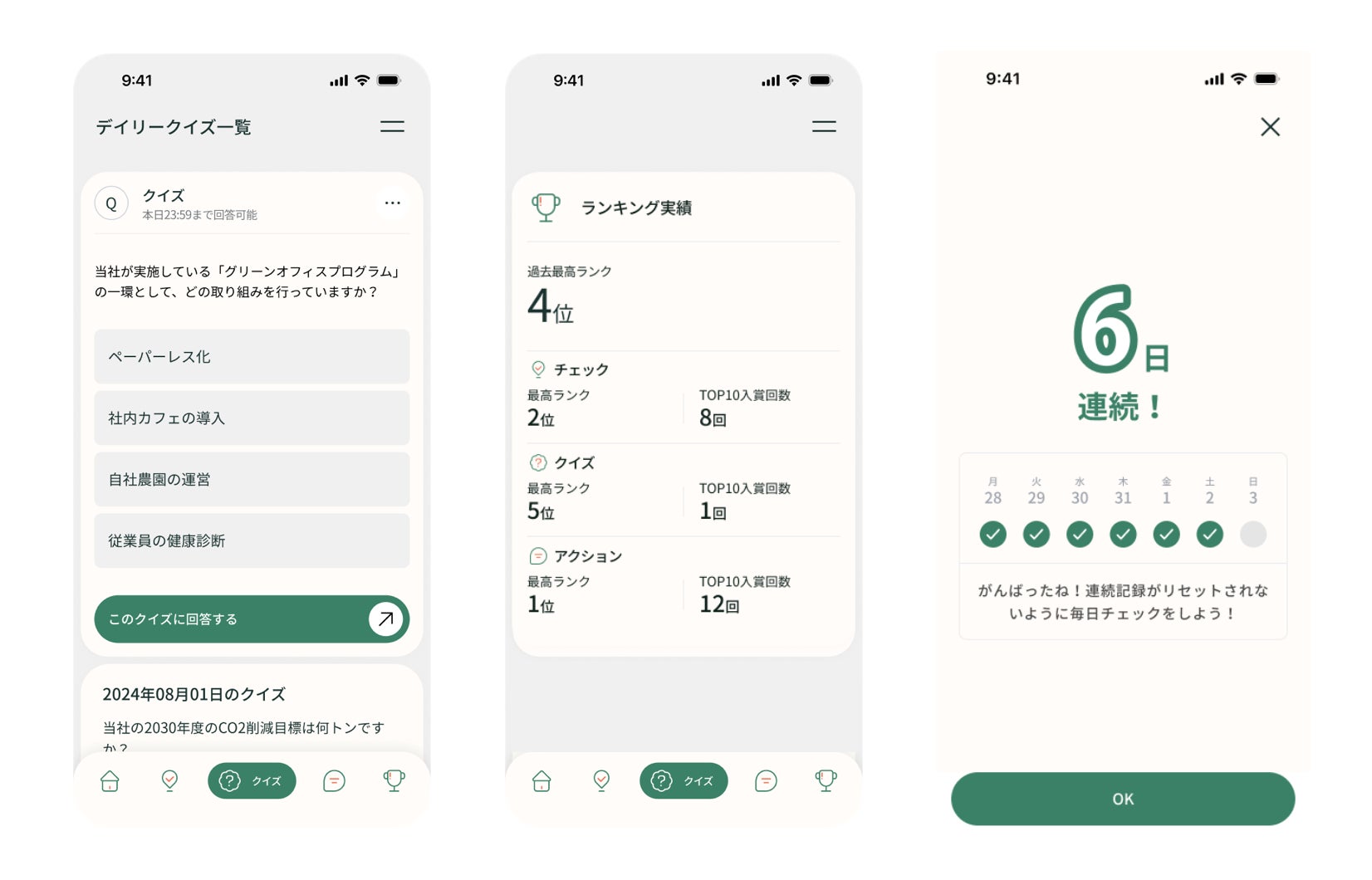 ラクラーAIは、従業員の脱炭素活動意識向上をサポートする「エコいっぽ」のAIスマートクイズ機能を基盤に開発されました。「エコいっぽ」では社員の参加率が90%と高いエンゲージメントを実現しており、この成功したクイズ機能をさらに進化させ、多様な企業ニーズに応える形でラクラーAIを開発しました。