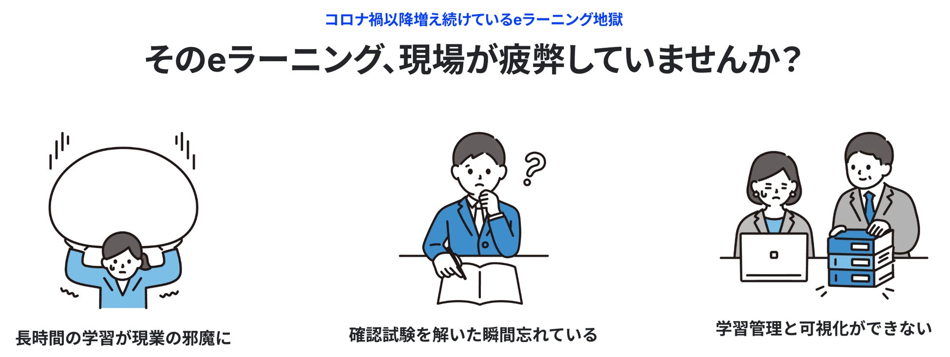 企業が抱える課題として、情報過多の時代における効果的な知識吸収と業務への活用が挙げられます。従来のeラーニングは、長時間の動画視聴や試験形式が主流で、受験者・管理者双方に負担が大きく、学習が形式化する傾向がありました。その結果、実質的なナレッジの蓄積が難しい現状があります。