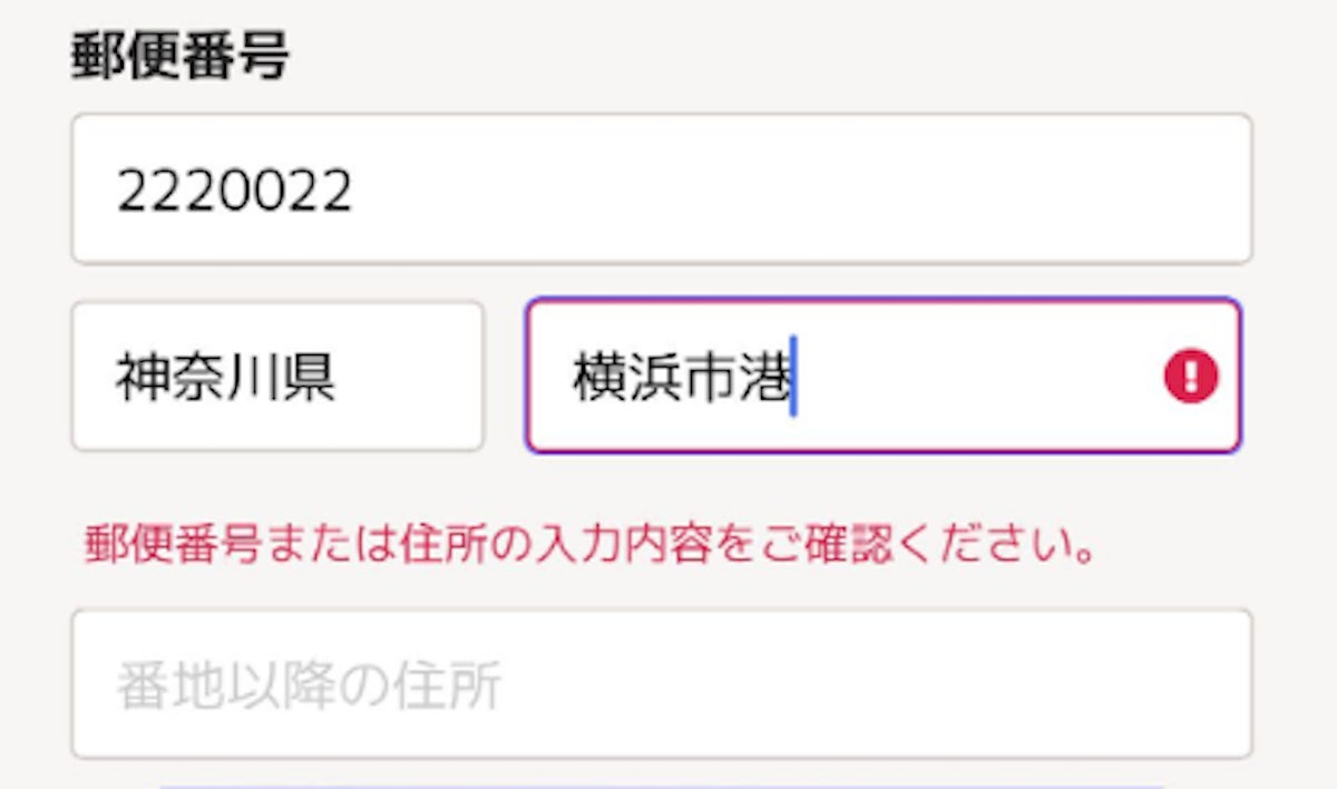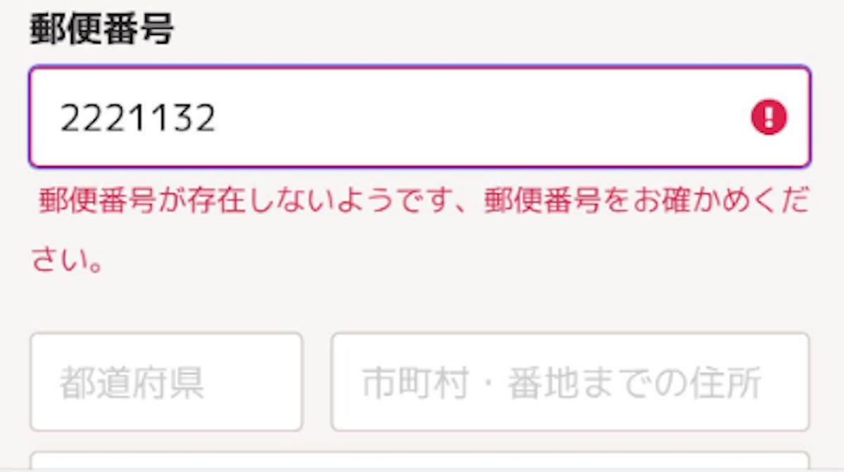 ミニアプリで郵便番号、住所を入力してもらう際、情報が間違っていた場合にエラーメッセージを表示します。