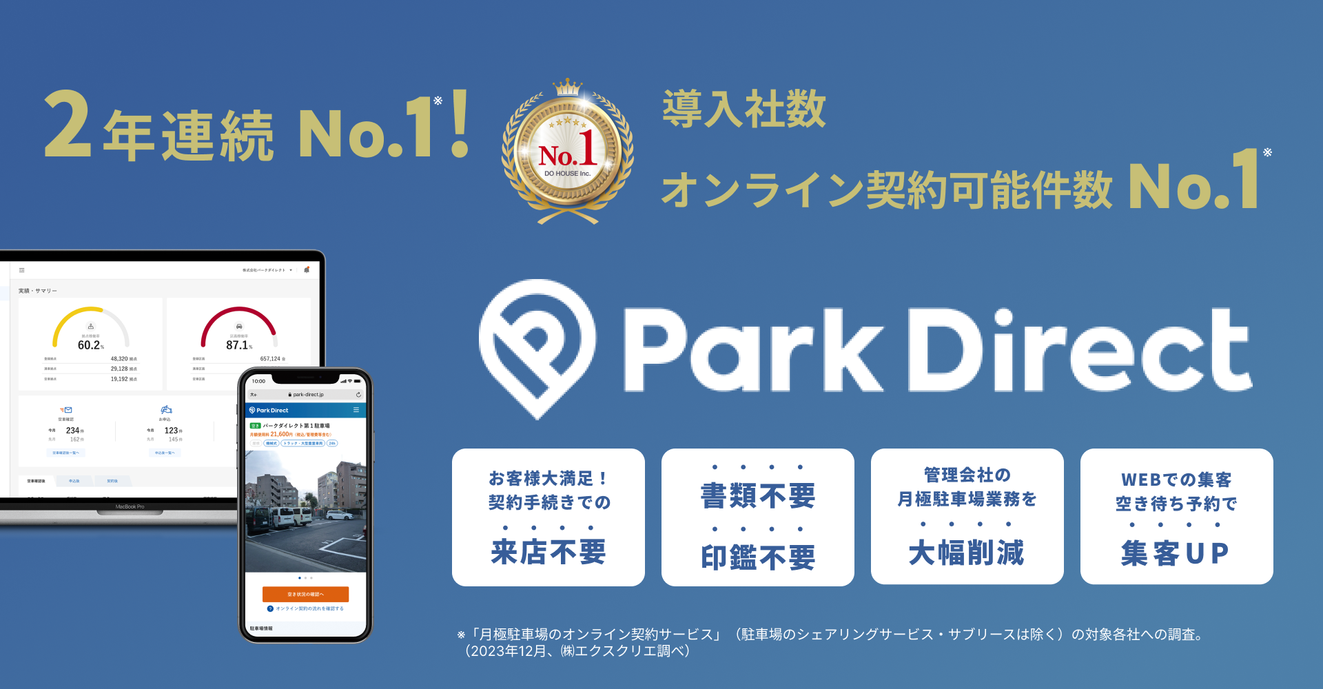 「Park Direct(パークダイレクト)」(https://www.park-direct.jp)は、駐車場にまつわるあらゆる業務(集客・契約・決済・顧客管理)を一気通貫でデジタル化するモビリティSaaSです。月極駐車場の各種手続き(※2)を全てオンラインで完結させ、不動産会社様や借主様の駐車場契約・管理にまつわるアナログなプロセスを大幅に削減します。さらに、駐車場ごとのデータに基づきオンライン/オフラインを問わない様々な集客施策を設計、展開し、月極駐車場の稼働率アップ、オーナー様の収益アップに貢献いたします。