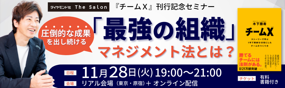 本書の刊行を記念して、ビジネスパーソンのための学びの場・ダイヤモンド社「The Salon(ザ・サロン)」にて特別セミナーの開催も決定。著者・木下勝寿氏が、圧倒的な成果を出し続ける「最強の組織」マネジメント法を伝授します。