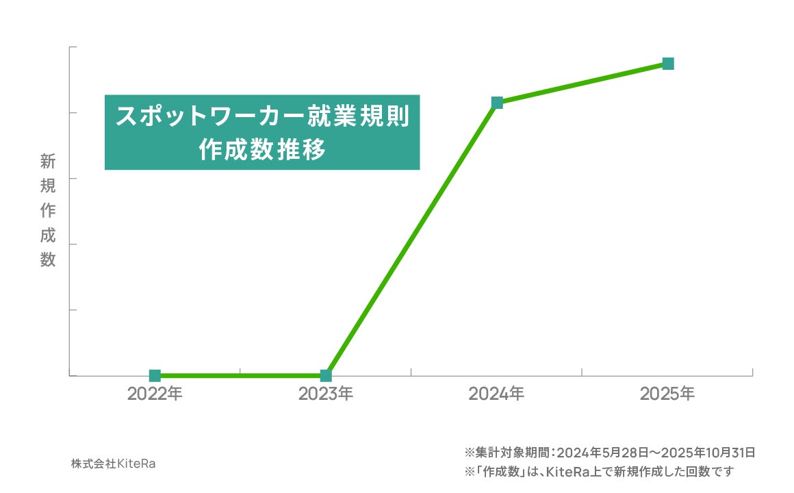 併せて、プラットフォーム各社でも規約や運用の明確化が進んでおり、契約成立タイミングや事業者都合キャンセル時の取扱い等を前提に、現場での手順・教育を規程とセットで整備する必要性が高まっています。現場では当日ミニ研修・危険作業の制限・割増計算の明確化まで含む規程と手順の平準化が加速しており、当社データでも「スポットワーカー就業規則」の作成数は前年比で増加しています。