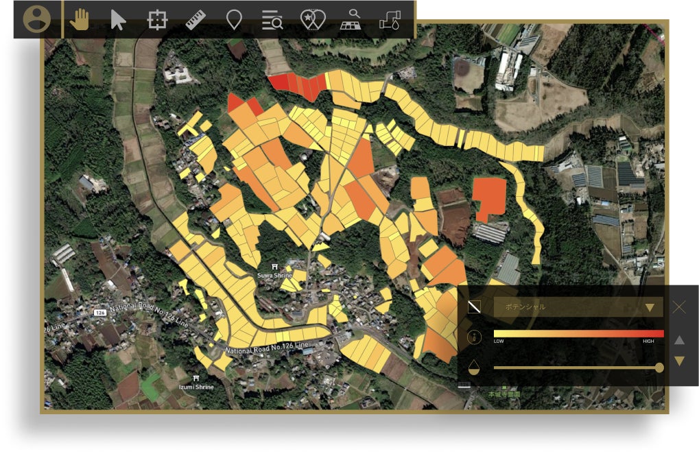 天地人が開発した「天地人コンパス」は、地球観測衛星のビッグデータを始めとする様々なデータ(宇宙ビッグデータ)を基に、解析、可視化、データ提供を行うWebGISサービスです。農業から都市開発まで、様々な目的に合わせてカスタマイズが可能で、最適な土地を宇宙から見つけることができます。
