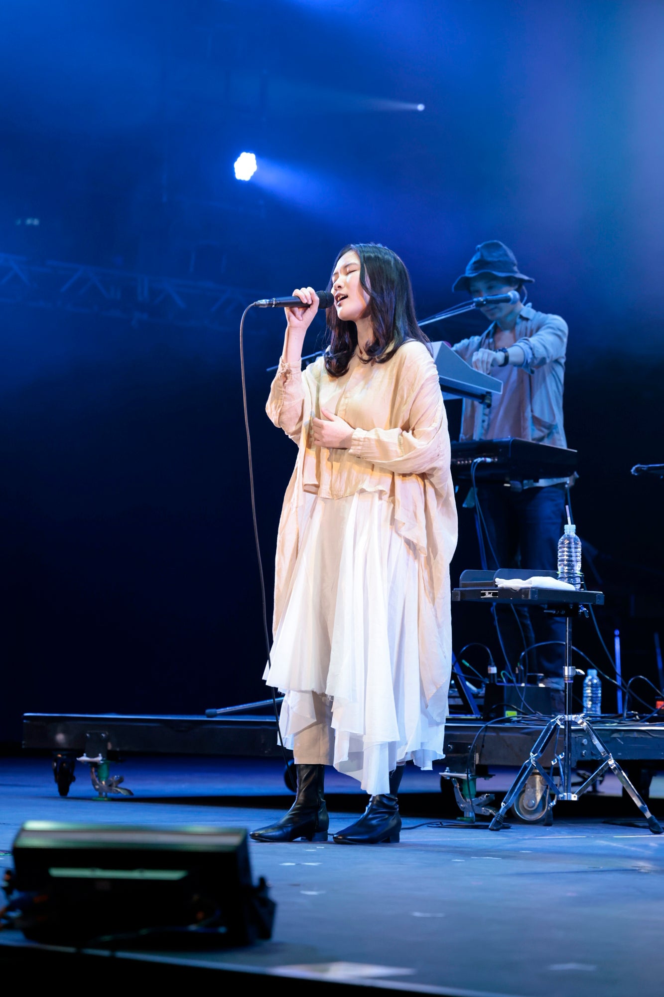 2曲目は夕陽のようなライトに包まれて『願い』を歌う。彼女の声とアコギの音の調和が美しい。
