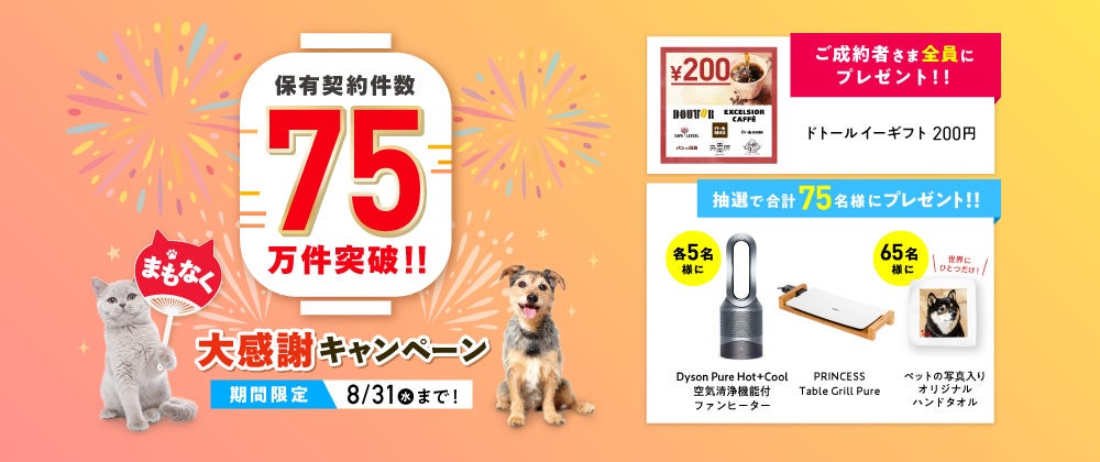 本キャンペーンは、期間中にお申込みいただいたご成約者さま全員に「ドトール イーギフト 200円」をプレゼントします。さらに抽選で合計75名様に、豪華家電製品や、ペットの写真で作るオリジナルハンドタオルが当たります。