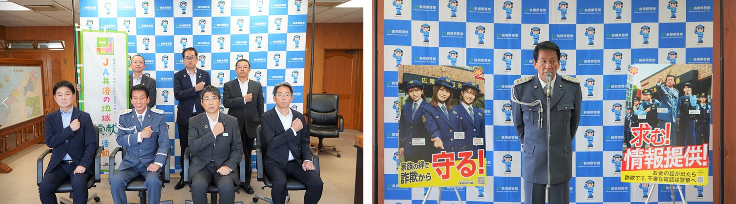 警察としても、県民の皆様との信頼関係をしっかりと構築し、常に相談できる・される関係になってほしいと思います。今後も全国の防犯協会などと協力して特殊詐欺根絶に向けた対策を考え、一刻も早く特殊詐欺の犯人の根幹を絶てるよう努めていきますので、島根県の皆様のご協力をよろしくお願いします。」と、思いを語りました。