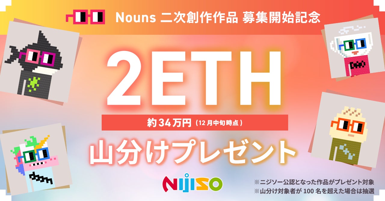 本日、一般社団法人オタクコイン協会・BlockBase株式会社は、クリエイターの二次創作活動を積極的に支援する『ニジソー(https://niji.so)』にて、1月31日までに「Nouns」キャラクターの二次創作作品を申請しニジソー公認された方を対象に、2ETHを山分けプレゼントするキャンペーンを発表しました。