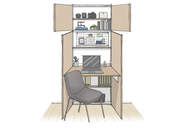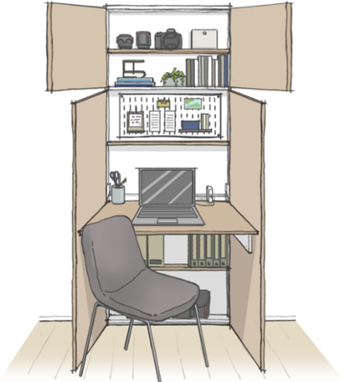 居住空間に圧迫感が生じない薄型の形状とし、本来ならデッドスペースとなるリビングや洋室の一角に据えることで、居住スペースを確保しつつ、作業が必要な時はデスクに、普段は収納として活用できます。