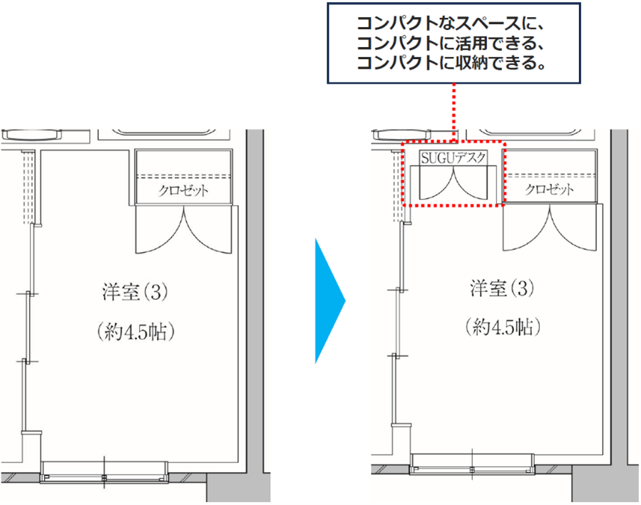 リモートワークの普及により、自宅での作業スペースやゆとりある広さ、快適性などが求められる一方、分譲マンションの専有面積は狭小化の傾向にあります。そこで、部屋の中のデッドスペースになりがちな空間に設置でき、省スペース化を実現した収納型デスク『SUGUデスク』を開発しました。