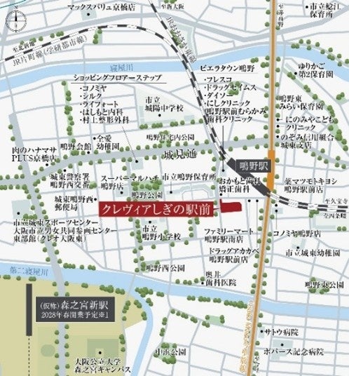 「クレヴィアしぎの駅前」は、JR片町線(学研都市線)・おおさか東線「鴫野」駅徒歩3分、Osaka Metro今里筋線「鴫野」駅徒歩4分に位置し、2駅3路線が利用可能です。JRおおさか東線「鴫野」駅からは、「新大阪」駅や「大阪」駅へダイレクトでアクセスでき、大阪城公園の豊かな緑を身近にしながら、大阪や梅田まで4.5km圏内という都市利便を享受できるポジションです。