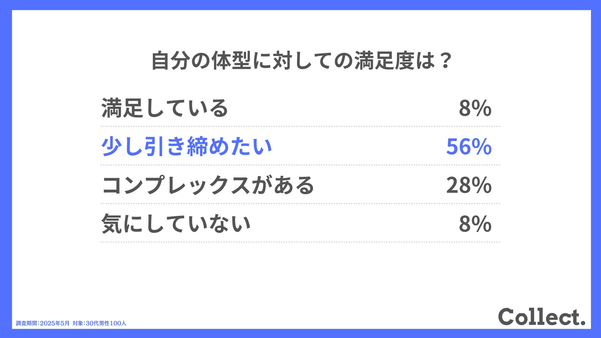 「少し引き締めたい(56%)」と答えた人が過半数を占め、多くの人が体型改善を望んでいることがうかがえる結果となりました。加齢による体型の変化が目に見えやすいため、現状維持よりも改善を目指す人が多いようです。