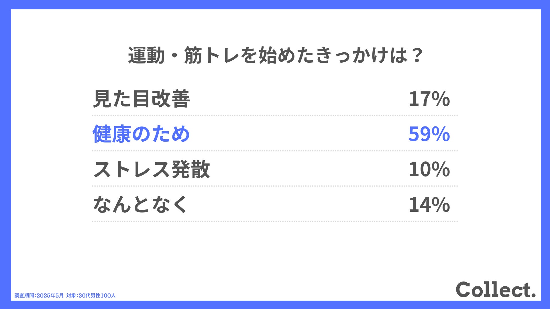 最多は「健康のため(59%)」で、次点の「見た目改善(17%)」を大きく上回りました。美容よりも健康維持を目的に運動を始める人が多いようです。