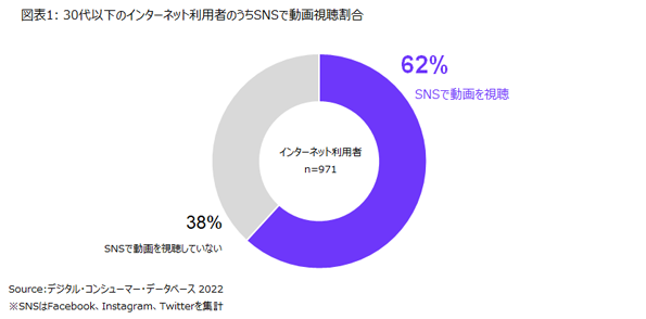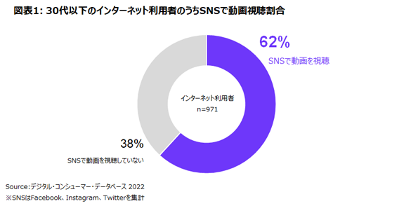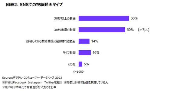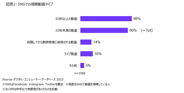 消費者の動画視聴動向を把握する上では、投稿動画サービスや有料動画サービスに注目されがちですが、SNS上での動画視聴に注目することも重要です。実際に2022年の9月時点では40%のインターネット利用者が主要SNS上で動画を視聴し、若年層ほどその傾向は強く、30代以下では62%がSNS上で動画を視聴していました(図表1)。その中でも30秒以上の動画が最も多いものの、30秒未満の短編の動画は昨年から7ポイント増加し60%に利用されています。数年前に「Instagram」にリール機能が追加されるなど、各サービスでの機能追加によって短編動画視聴は着実にSNS利用者の中で定着してきていることがわかります(図表2)。