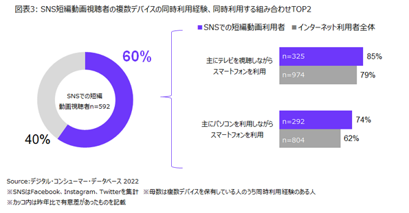 短編動画の場合、限られた時間の中で様々なコンテンツを手軽に楽しむことができるため、短編動画視聴者はより短い時間の中でより多くの情報を得ることを重視していることが考えられます。また、図表にはありませんが、短編動画を視聴する人ほどSNS内のおすすめ機能を活用する割合が低く、自分の気に入ったものを自分から探して視聴している傾向があります。つまり、メディア視聴環境が多様化する中で自分の好きなコンテンツを中心に視聴する短編動画視聴者は、各メディアに費やす視聴時間の分散化を促し、自分の興味に合わせてコンテンツを部分的に選んでいることが考えられます。実際にSNSで動画を利用する人では複数デバイスを利用する傾向も高く、インターネット利用者全体では43%の人が複数デバイスの同時利用経験があるのに対し、SNSで短編動画を視聴する人では60%にものぼっていました。また、テレビを視聴しながらのスマートフォン利用が最も多く85%、30秒未満の短編動画を利用している人ではその傾向が特に高くなっていました(図表3)。つまり、テレビとデジタルの両方を組み合わせて実施する広告キャンペーンの場合、消費者がどのようなタイミングでどちらのメディアに集中しているのかを考慮し、効率的にコミュニケーションを取るために、例えばテレビでは「音」で消費者の注目を惹くのに対し、デジタルではターゲットの関心の高いテーマを設定するなど、広告に注目してもらう方法を考えることが一層重要になっています。