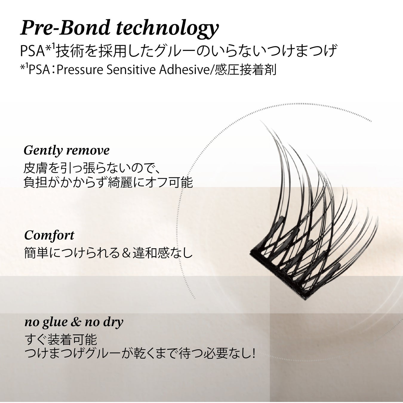 この革新技術により、まつげとOllioを軽く押すだけで粘着力が高まり、ピタッと密着が可能に。