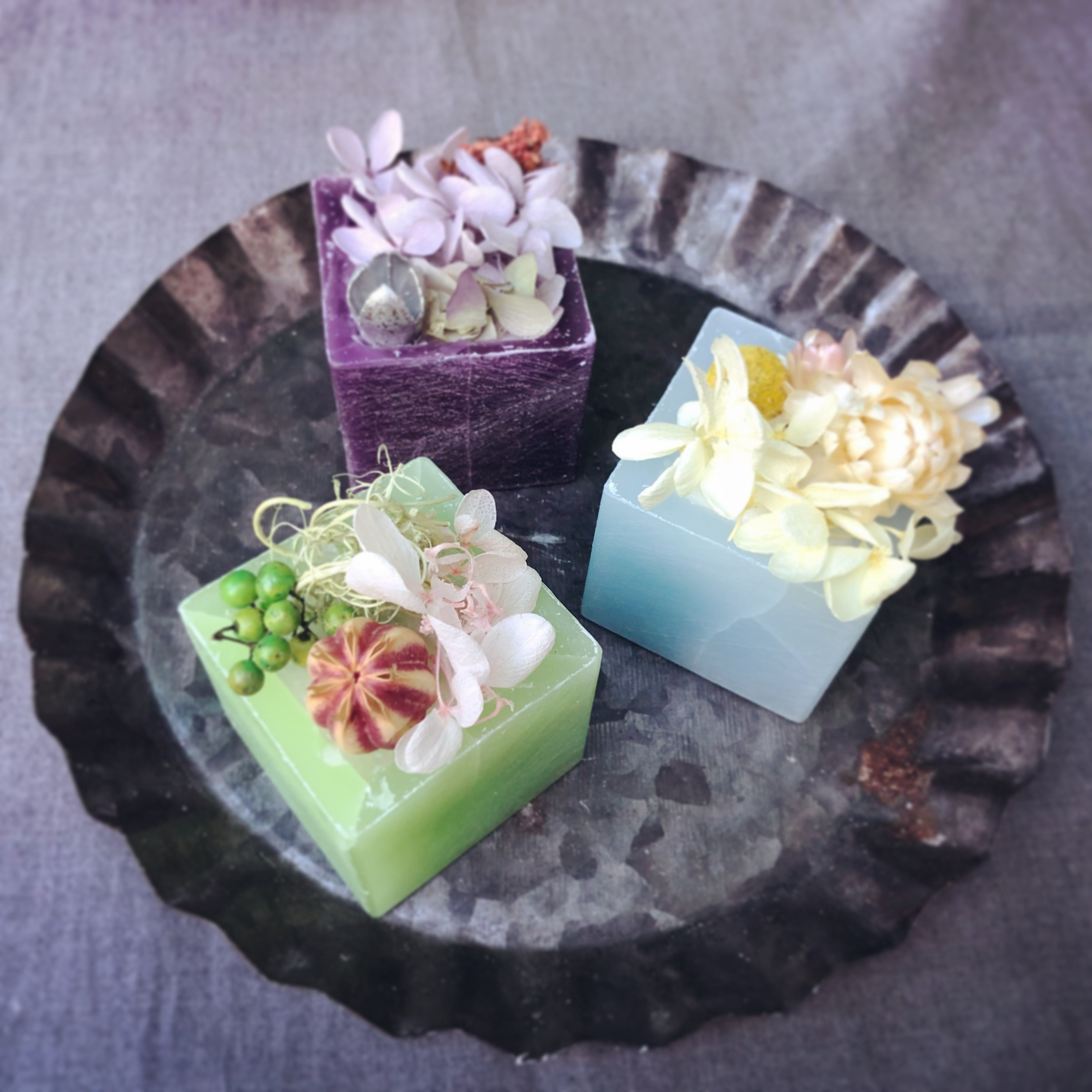 カラフルなベースから一つ選んで頂き、お好きなお花と香りでオリジナルの置き型アロマポットを制作できます。 ※ベースのカラーには限りがございます。