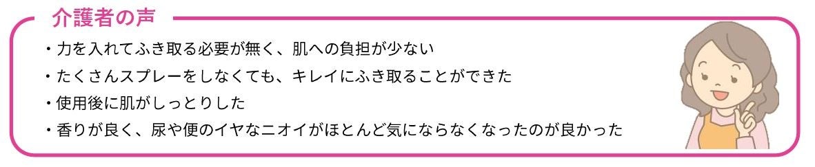 当社が実施した「在宅介護における大人用おしりふきの使用実態調査」※1では、トイレでの尿や便のふき取りの際にお使いのもので「大人用おしりふきを使用している」と回答した割合は、尿ふき取り時と便ふき取り時ともに約20%に留まりました。また、大人用おしりふきを使わない理由として、56.0%が「ちり紙・トイレットペーパーで十分だから」、51.4%が「価格が高いから」と回答※2しました。高齢者の薄い皮膚は外部刺激に弱く、尿や便のアルカリ性が皮膚に残ることでスキントラブルが発生する可能性が高まります。このため、大人用おしりふきを使用し汚れをしっかりとふき取ることが重要ですが、トイレットペーパーで十分に汚れが落ちていると考えていたり、コストがかかるという理由からトイレットペーパーのみでふき取っている介護者が多い現状が浮き彫りとなりました。